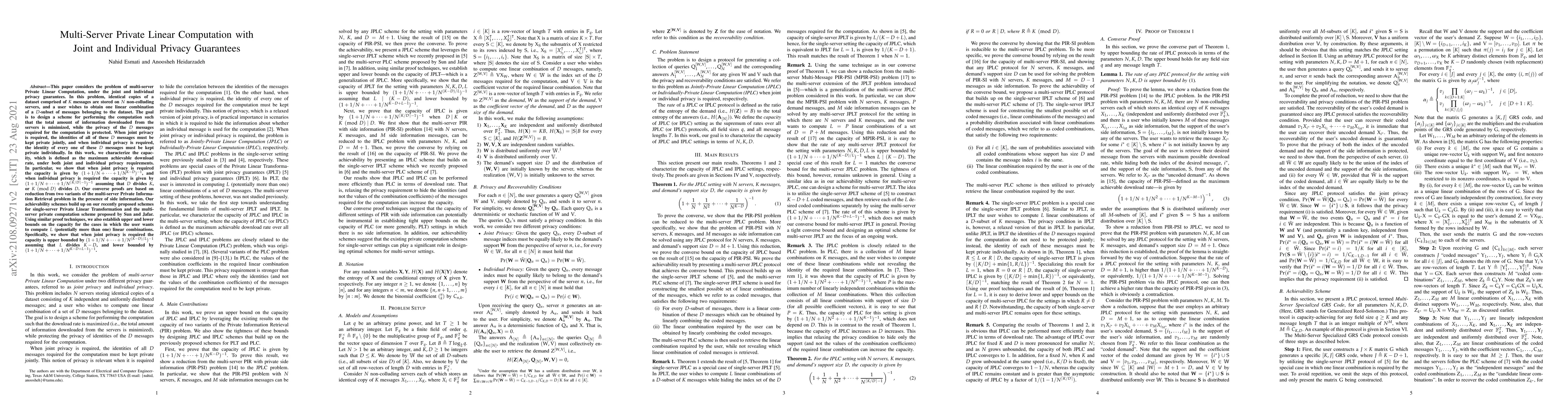 This paper investigates multi-server Private Linear Computation under joint and individual privacy guarantees, determining the maximum achievable download rate (capacity) for both scenarios. It establishes capacity formulas and proves bounds using techniques from multi-server Private Information Retrieval and existing private computation schemes.