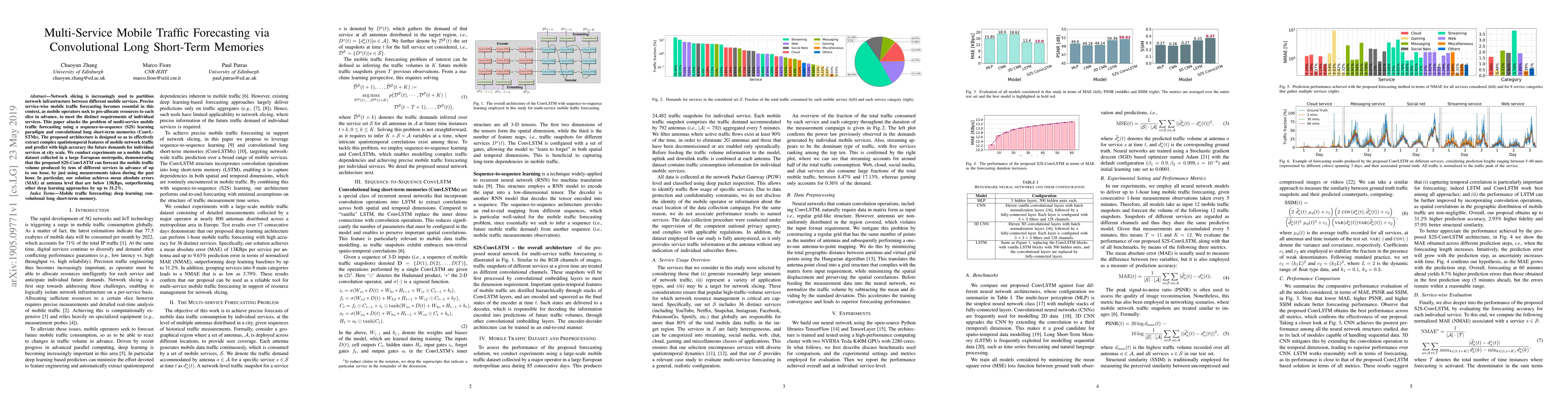This paper proposes a sequence-to-sequence learning model with convolutional long short-term memories (ConvLSTMs) for multi-service mobile traffic forecasting. The model effectively predicts future traffic demands for individual services, achieving mean absolute errors below 13KBps and outperforming other deep learning methods by up to 31.2%.