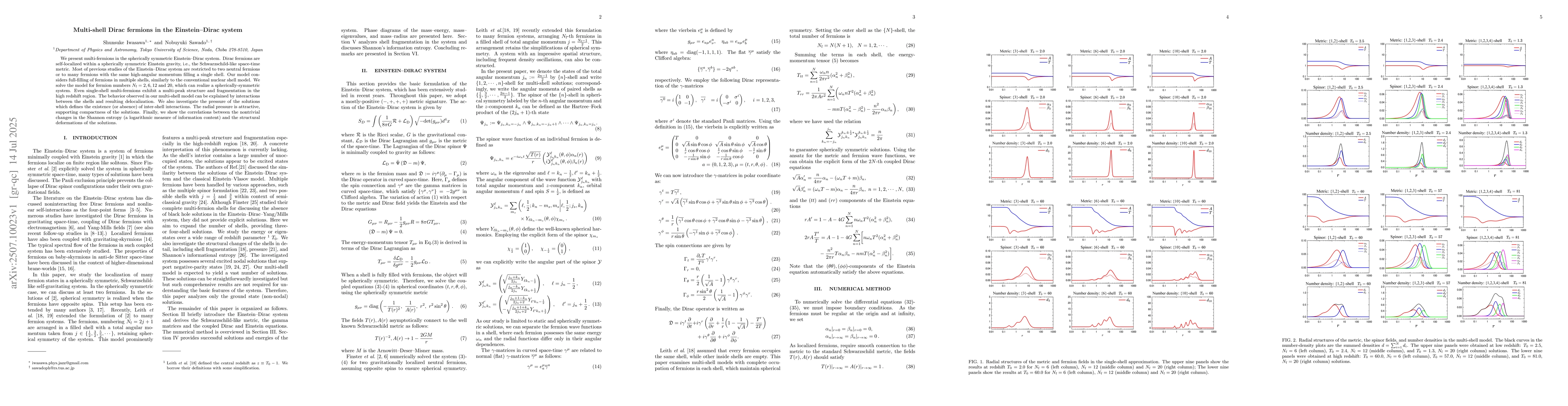 We present multi-fermions in the spherically symmetric Einstein--Dirac system. Dirac fermions are self-localized within a spherically symmetric Einstein gravity, i.e., the Schwarzschild-like space-time metric. Most of previous studies of the Einstein--Dirac system are restricted to two neutral fermions or to many fermions with the same high-angular momentum filling a single shell. Our model considers full-filling of fermions in multiple shells, similarly to the conventional nuclear shell model. We solve the model for fermion numbers $N_\textrm{f}=2,6,12$ and $20$, which can realize a spherically-symmetric system. Even single-shell multi-fermions exhibit a multi-peak structure and fragmentation in the high redshift region. The behavior observed in our multi-shell model can be explained by interactions between the shells and resulting delocalization. We also investigate the pressure of the solutions which defines the existence (or absence) of inter-shell interactions. The radial pressure is attractive, supporting compactness of the solutions. Finally, we show the correlations between the nontrivial changes in the Shannon entropy (a logarithmic measure of information content) and the structural deformations of the solutions.
