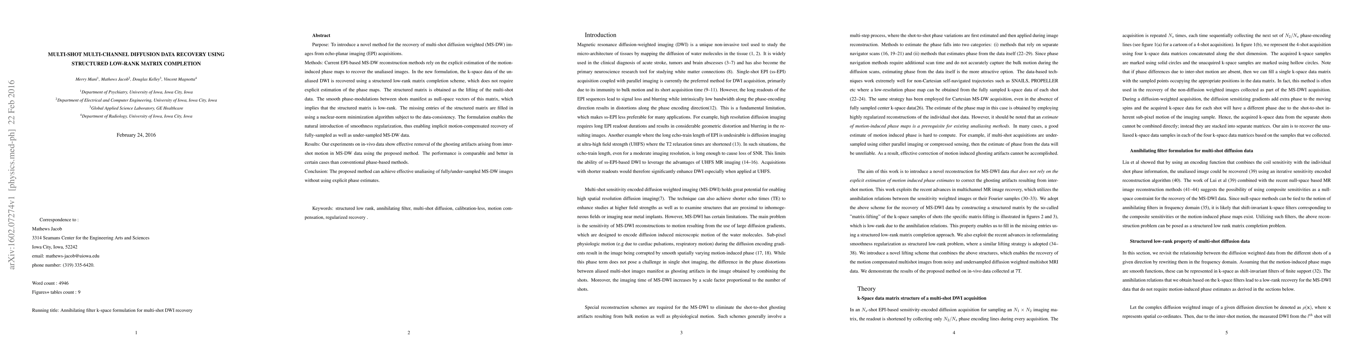 This paper introduces a novel method for recovering multi-shot diffusion weighted images using structured low-rank matrix completion, which effectively removes ghosting artifacts from intershot motion without requiring explicit phase map estimation. The method shows comparable or superior performance to conventional phase-based methods.