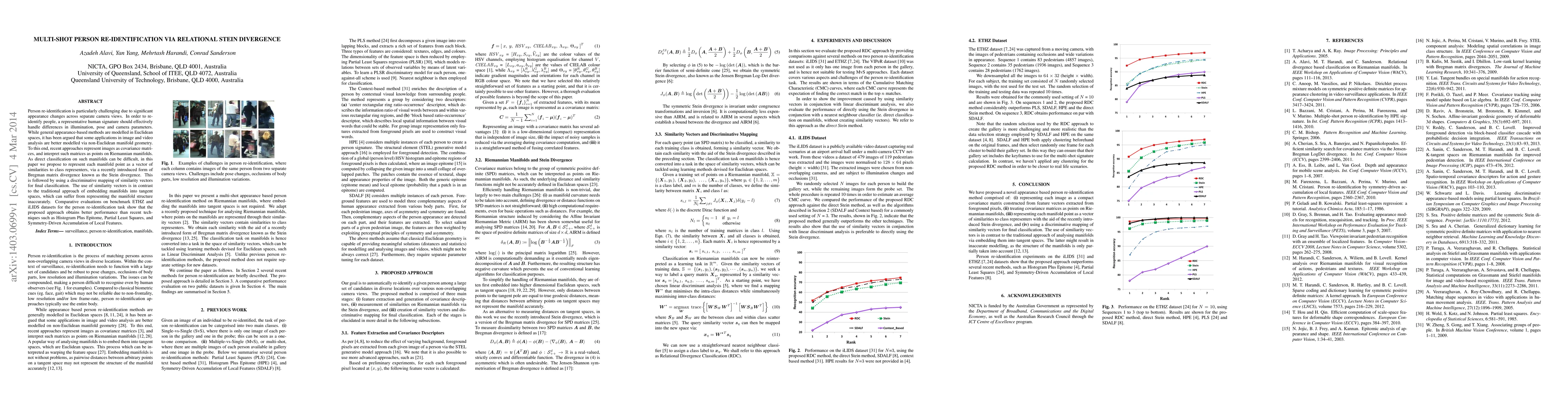 Person re-identification is particularly challenging due to significant appearance changes across separate camera views. In order to re-identify people, a representative human signature should effectively handle differences in illumination, pose and camera parameters. While general appearance-based methods are modelled in Euclidean spaces, it has been argued that some applications in image and video analysis are better modelled via non-Euclidean manifold geometry. To this end, recent approaches represent images as covariance matrices, and interpret such matrices as points on Riemannian manifolds. As direct classification on such manifolds can be difficult, in this paper we propose to represent each manifold point as a vector of similarities to class representers, via a recently introduced form of Bregman matrix divergence known as the Stein divergence. This is followed by using a discriminative mapping of similarity vectors for final classification. The use of similarity vectors is in contrast to the traditional approach of embedding manifolds into tangent spaces, which can suffer from representing the manifold structure inaccurately. Comparative evaluations on benchmark ETHZ and iLIDS datasets for the person re-identification task show that the proposed approach obtains better performance than recent techniques such as Histogram Plus Epitome, Partial Least Squares, and Symmetry-Driven Accumulation of Local Features.