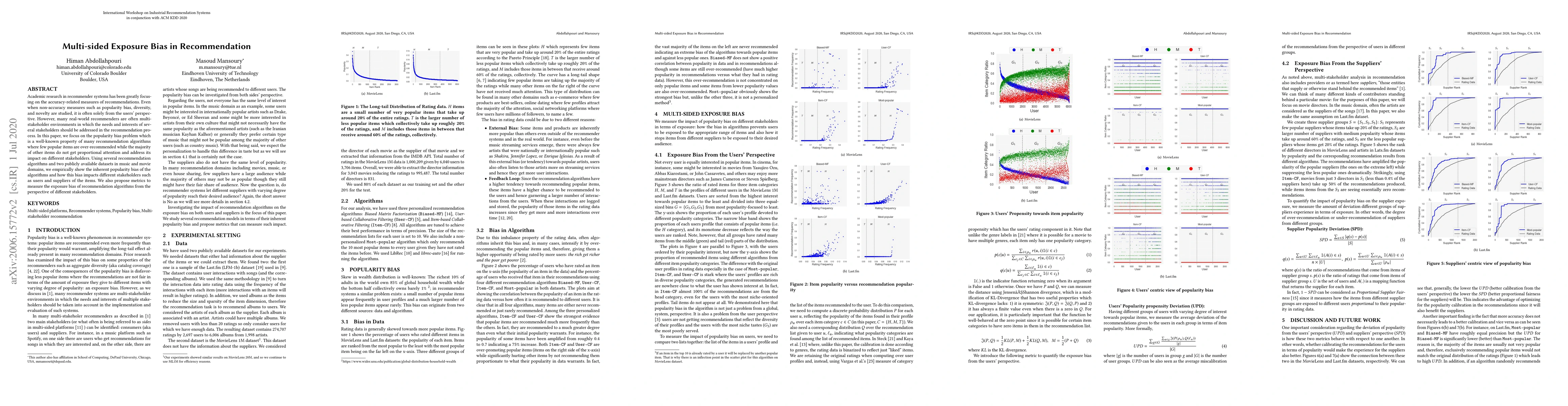 This paper investigates the popularity bias in recommender systems from a multi-stakeholder perspective, demonstrating how over-recommendation of popular items impacts both users and item suppliers. It proposes new metrics to measure exposure bias across different stakeholders using empirical data from music and movie domains.