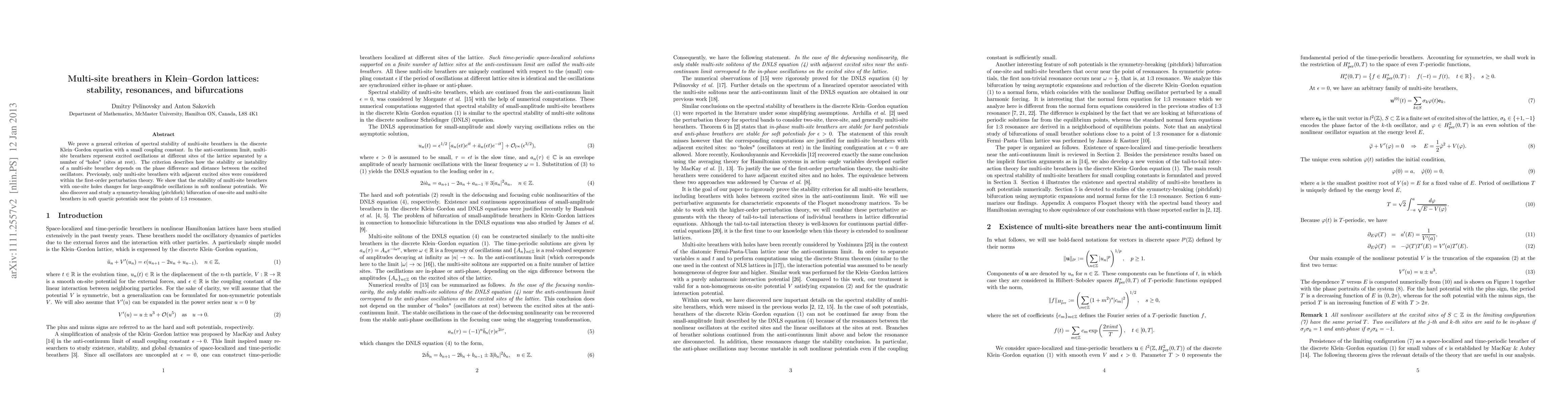 We prove the most general theorem about spectral stability of multi-site breathers in the discrete Klein-Gordon equation with a small coupling constant. In the anti-continuum limit, multi-site breathers represent excited oscillations at different sites of the lattice separated by a number of "holes" (sites at rest). The theorem describes how the stability or instability of a multi-site breather depends on the phase difference and distance between the excited oscillators. Previously, only multi-site breathers with adjacent excited sites were considered within the first-order perturbation theory. We show that the stability of multi-site breathers with one-site holes change for large-amplitude oscillations in soft nonlinear potentials. We also discover and study a symmetry-breaking (pitchfork) bifurcation of one-site and multi-site breathers in soft quartic potentials near the points of 1:3 resonance.