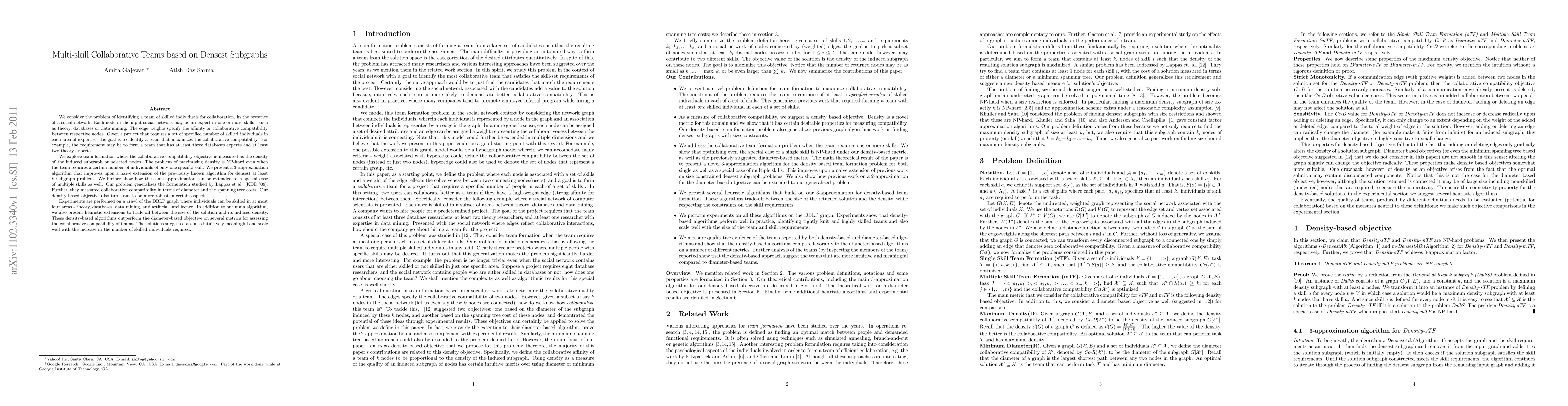 We consider the problem of identifying a team of skilled individuals for collaboration, in the presence of a social network. Each node in the social network may be an expert in one or more skills. Edge weights specify affinity or collaborative compatibility between respective nodes. Given a project that requires a set of specified number of skilled individuals in each area of expertise, the goal is to identify a team that maximizes the collaborative compatibility. For example, the requirement may be to form a team that has at least three databases experts and at least two theory experts. We explore team formation where the collaborative compatibility objective is measured as the density of the induced subgraph on selected nodes. The problem of maximizing density is NP-hard even when the team requires individuals of only one skill. We present a 3-approximation algorithm that improves upon a naive extension of the previously known algorithm for densest at least $k$ subgraph problem. We further show how the same approximation can be extended to a special case of multiple skills. Our problem generalizes the formulation studied by Lappas et al. [KDD '09] who measure team compatibility in terms of diameter or spanning tree costs. Experiments are performed on a crawl of the DBLP graph where individuals can be skilled in at most four areas - theory, databases, data mining, and artificial intelligence. In addition to our main algorithm, we also present heuristic extensions to trade off between the size of the solution and its induced density. These density-based algorithms outperform the diameter-based objective on several metrics for assessing the collaborative compatibility of teams. The solutions suggested are also intuitively meaningful and scale well with the increase in the number of skilled individuals required.