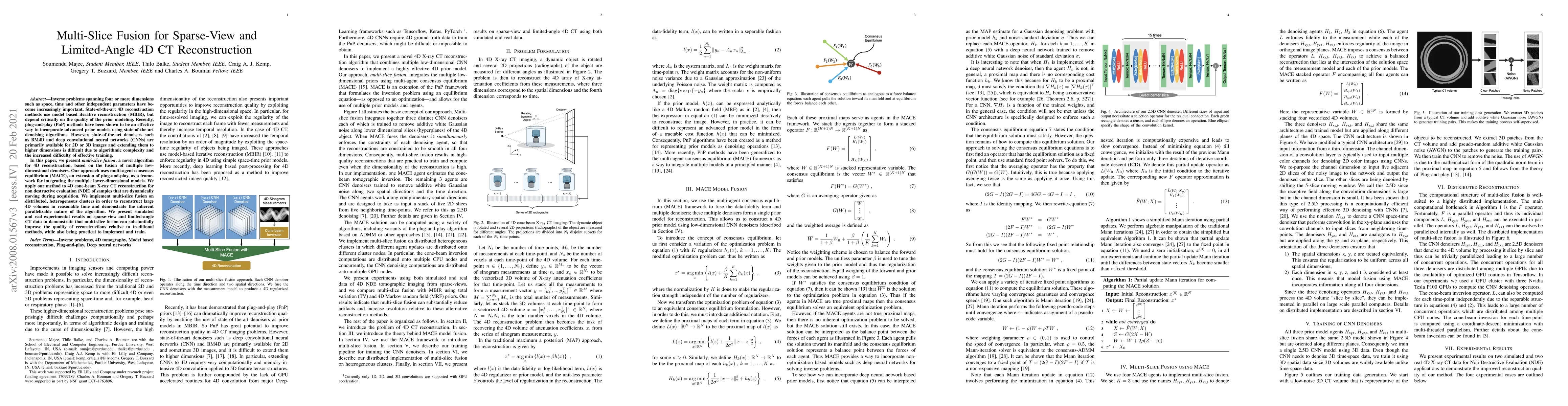 This paper introduces multi-slice fusion, a novel algorithm for 4D CT reconstruction using multiple low-dimensional denoisers integrated via multi-agent consensus equilibrium. The method significantly improves reconstruction quality for sparse-view and limited-angle data, demonstrating practical implementation and effectiveness in distributed computing environments.