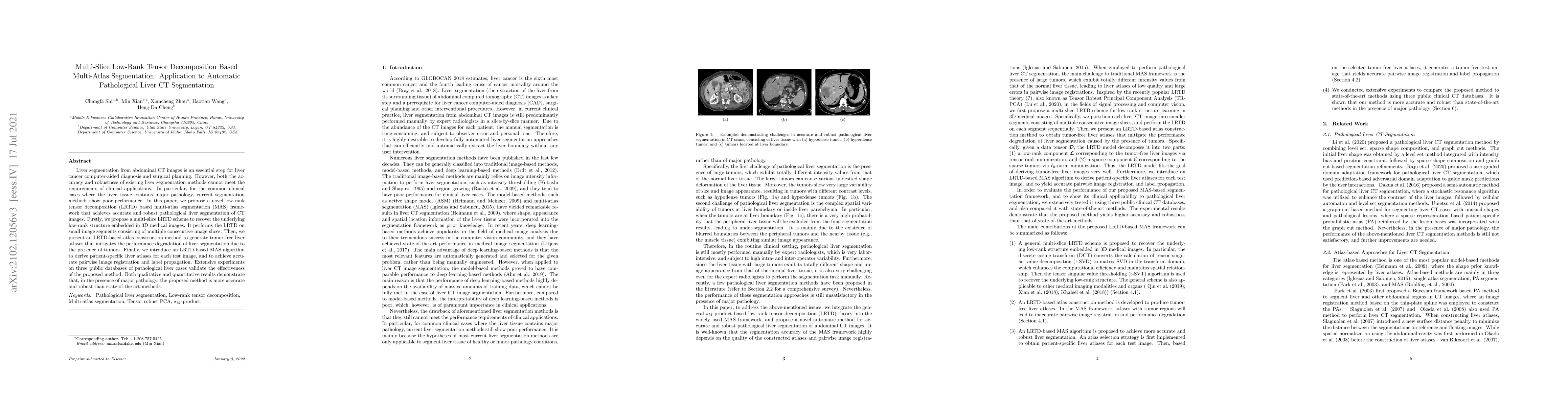 This paper presents a novel low-rank tensor decomposition (LRTD) based multi-atlas segmentation framework for accurate and robust pathological liver segmentation in CT images. The proposed method includes multi-slice LRTD for image recovery, LRTD-based atlas construction to generate tumor-free liver atlases, and an LRTD-based MAS algorithm for patient-specific liver atlas derivation, achieving superior performance in the presence of major liver pathologies.