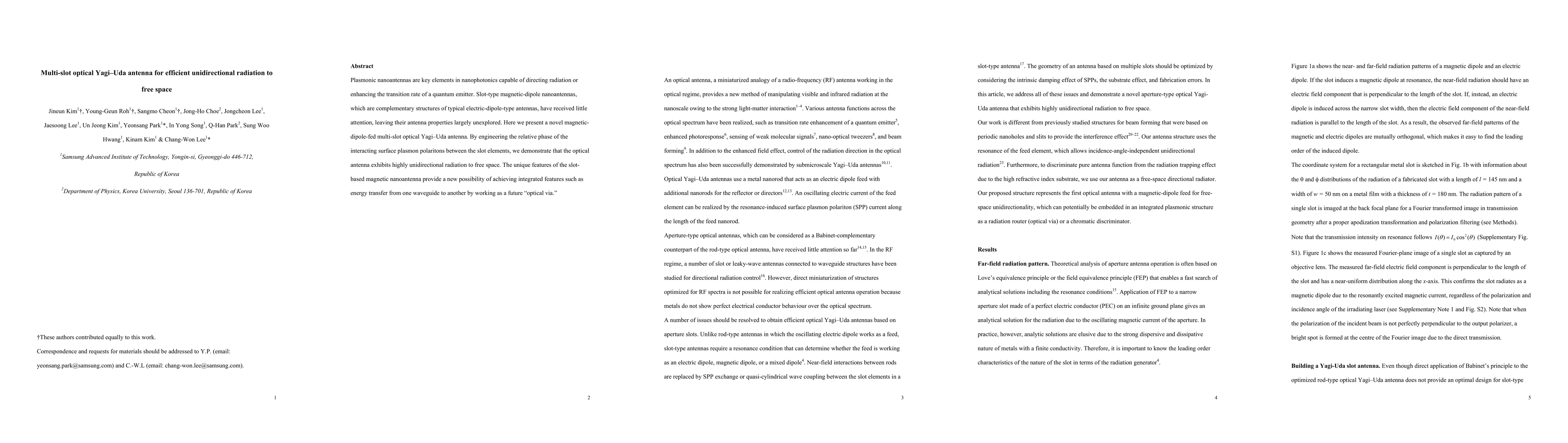 The research presents a novel multi-slot optical Yagi-Uda antenna designed for efficient unidirectional radiation to free space. It utilizes plasmonic nanoantennas, specifically magnetic-dipole-fed multi-slot antennas, to direct radiation and enhance the transition rate of quantum emitters.