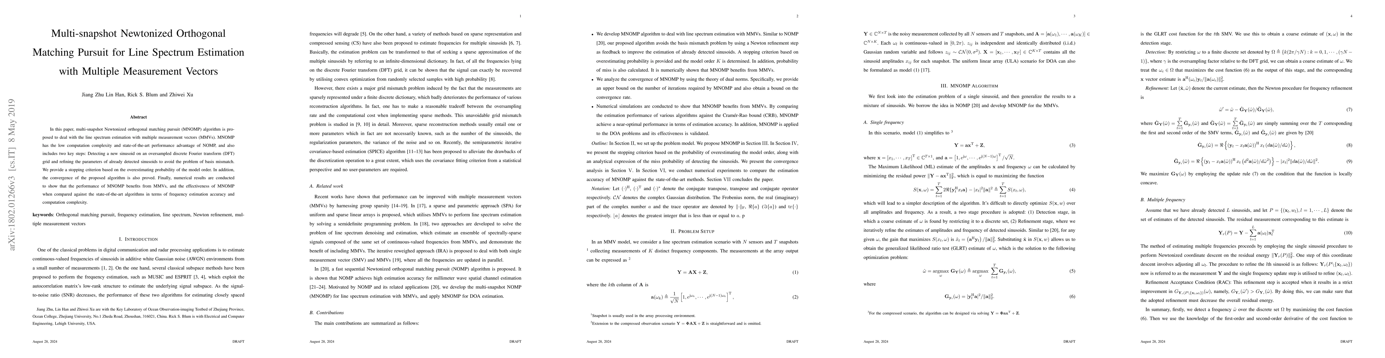 This paper proposes the multi-snapshot Newtonized orthogonal matching pursuit (MNOMP) algorithm for line spectrum estimation with multiple measurement vectors (MMVs), offering low computation complexity and superior performance. The MNOMP refines detected sinusoids and includes a stopping criterion based on model order overestimation, with proven convergence. Numerical results demonstrate its effectiveness in frequency estimation accuracy and computational efficiency compared to state-of-the-art methods.