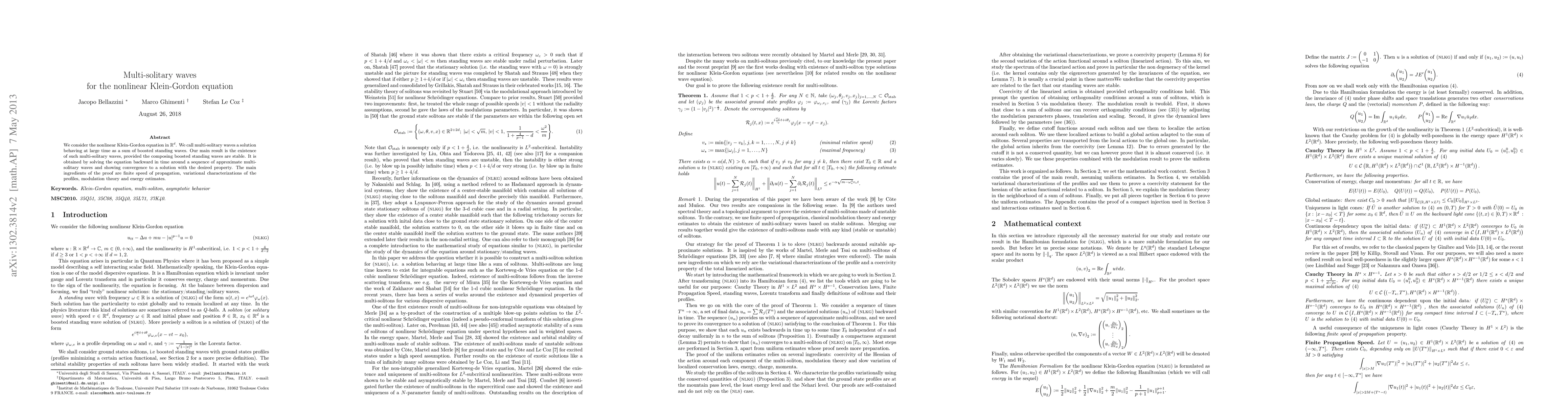 This paper establishes the existence of multi-solitary waves for the nonlinear Klein-Gordon equation, where these waves behave as sums of boosted standing waves at large times. The proof leverages backward solving, finite speed of propagation, variational methods, modulation theory, and energy estimates.