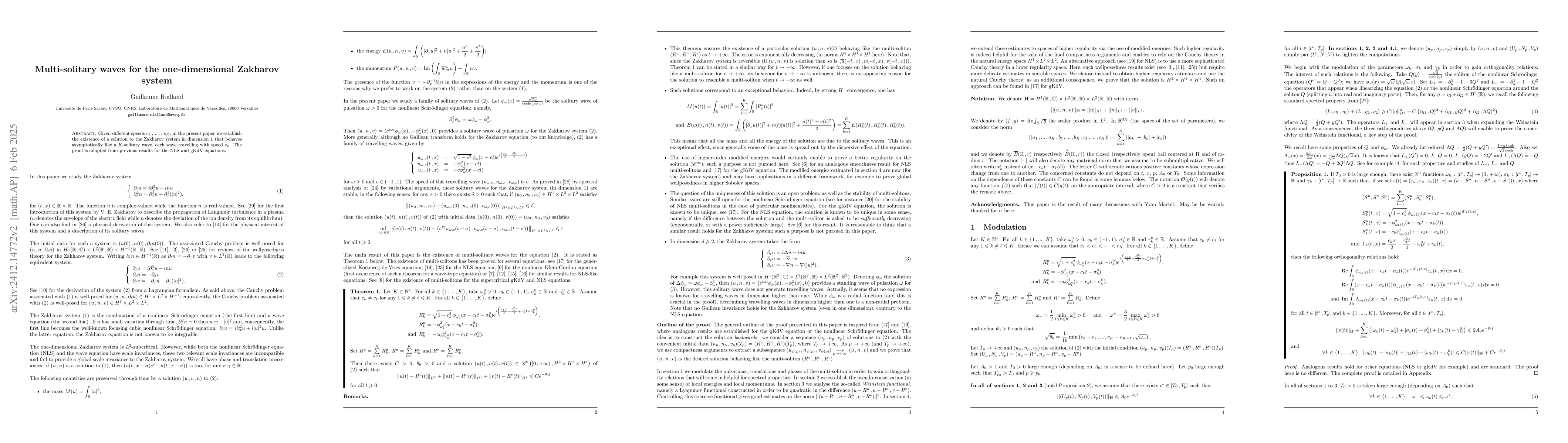 This paper proves the existence of solutions to the one-dimensional Zakharov system that asymptotically resemble $K$ solitary waves, each traveling at distinct speeds $c_1, ..., c_K$, utilizing adapted methods from prior work on the NLS and gKdV equations.