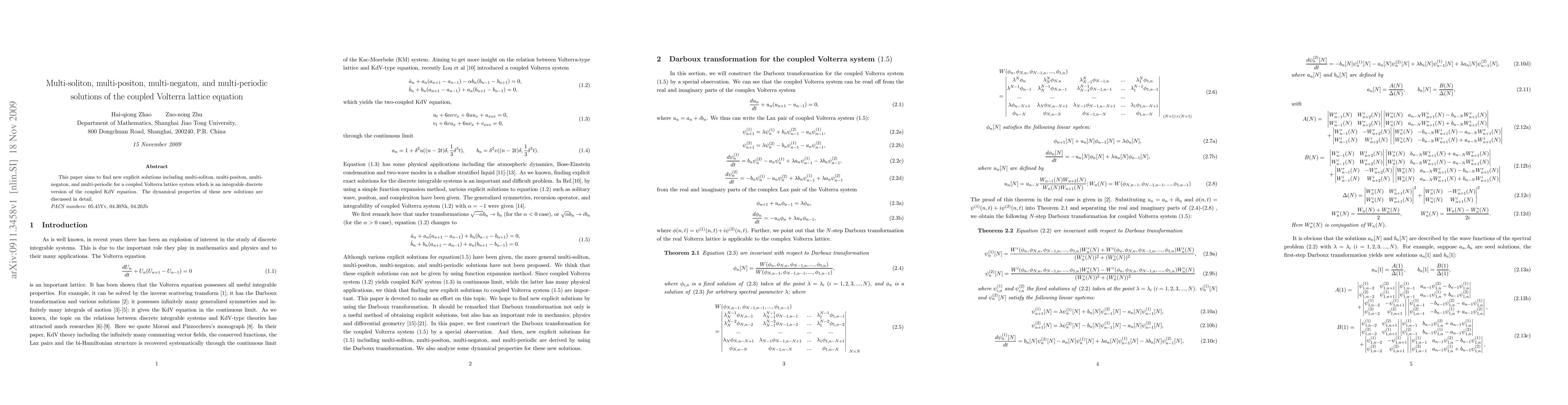 This paper presents new explicit solutions for a coupled Volterra lattice system, including multi-soliton, multi-positon, multi-negaton, and multi-periodic solutions, and discusses their dynamical properties in detail.