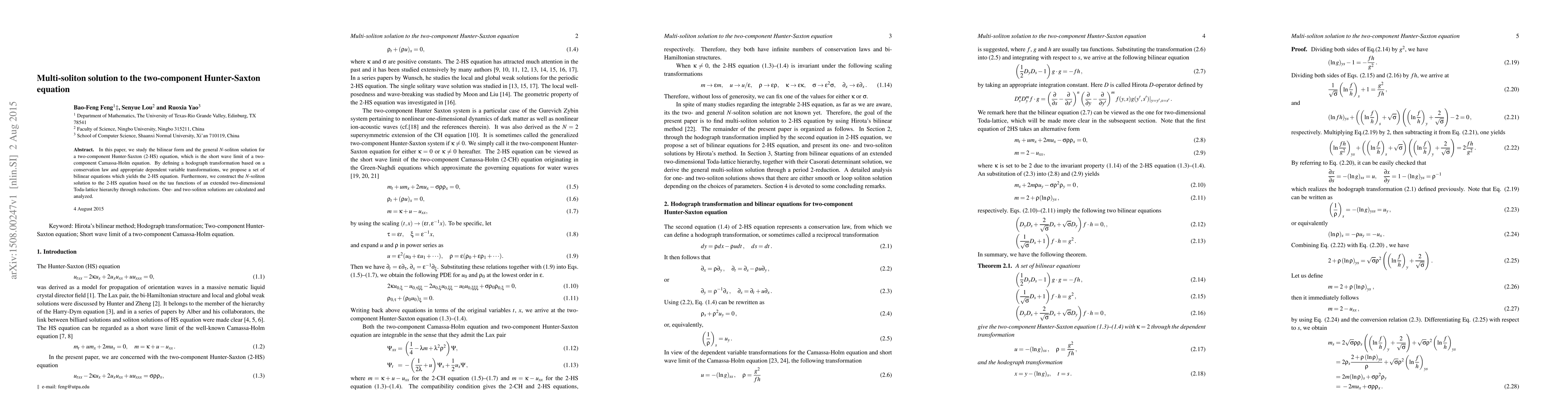 This paper presents a method to find multi-soliton solutions for the two-component Hunter-Saxton equation, derived from a bilinear form and a conservation law. The N-soliton solutions are constructed using tau functions from an extended two-dimensional Toda-lattice hierarchy, with one- and two-soliton solutions calculated and analyzed as examples.