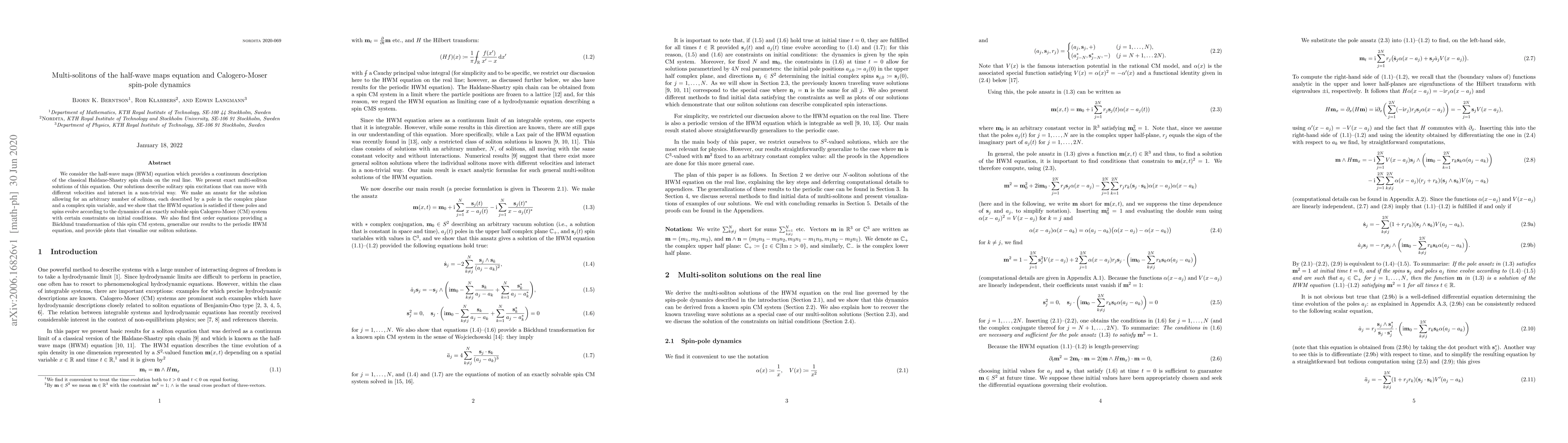 We consider the half-wave maps (HWM) equation which provides a continuum description of the classical Haldane-Shastry spin chain on the real line. We present exact multi-soliton solutions of this equation. Our solutions describe solitary spin excitations that can move with different velocities and interact in a non-trivial way. We make an ansatz for the solution allowing for an arbitrary number of solitons, each described by a pole in the complex plane and a complex spin variable, and we show that the HWM equation is satisfied if these poles and spins evolve according to the dynamics of an exactly solvable spin Calogero-Moser (CM) system with certain constraints on initial conditions. We also find first order equations providing a B\"acklund transformation of this spin CM system, generalize our results to the periodic HWM equation, and provide plots that visualize our soliton solutions.