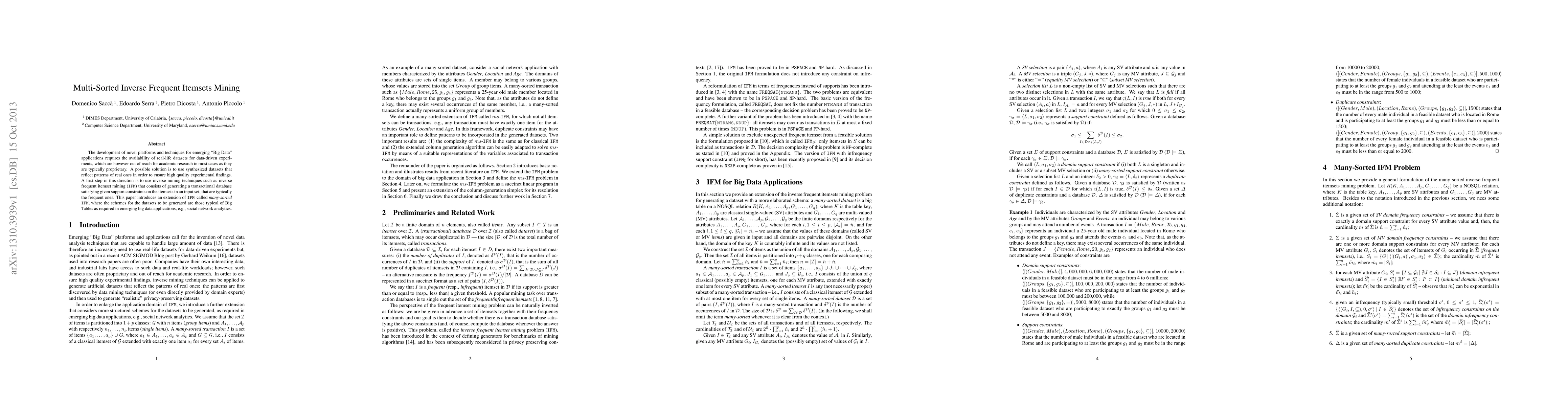 This paper introduces a new technique called many-sorted inverse frequent itemsets mining to generate synthetic datasets for Big Data applications. It creates transactional databases that satisfy support constraints on itemsets, enabling researchers to test real-life data-driven experiments.