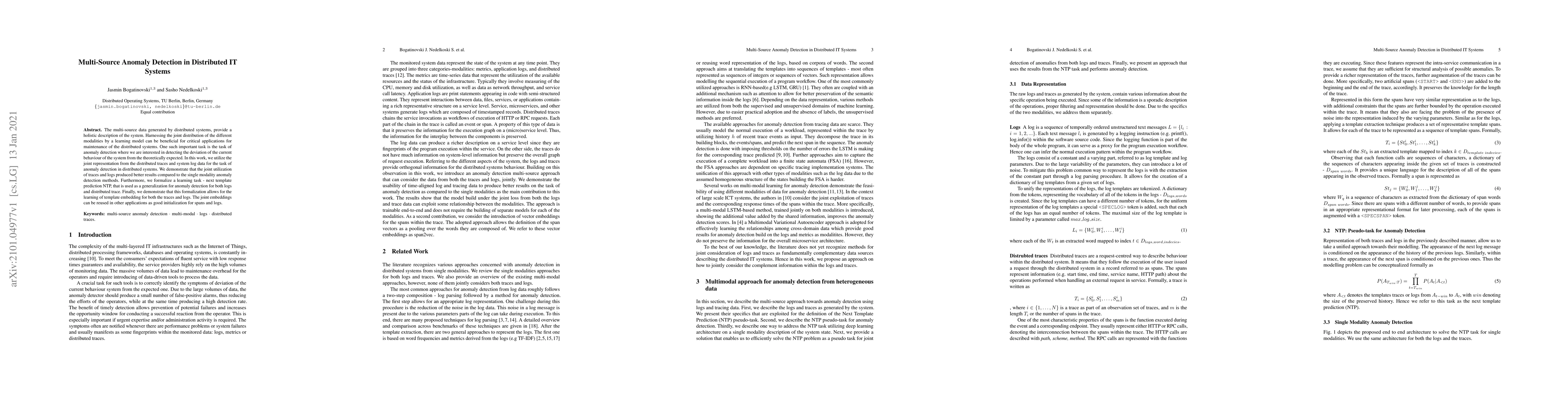 The multi-source data generated by distributed systems, provide a holistic description of the system. Harnessing the joint distribution of the different modalities by a learning model can be beneficial for critical applications for maintenance of the distributed systems. One such important task is the task of anomaly detection where we are interested in detecting the deviation of the current behaviour of the system from the theoretically expected. In this work, we utilize the joint representation from the distributed traces and system log data for the task of anomaly detection in distributed systems. We demonstrate that the joint utilization of traces and logs produced better results compared to the single modality anomaly detection methods. Furthermore, we formalize a learning task - next template prediction NTP, that is used as a generalization for anomaly detection for both logs and distributed trace. Finally, we demonstrate that this formalization allows for the learning of template embedding for both the traces and logs. The joint embeddings can be reused in other applications as good initialization for spans and logs.