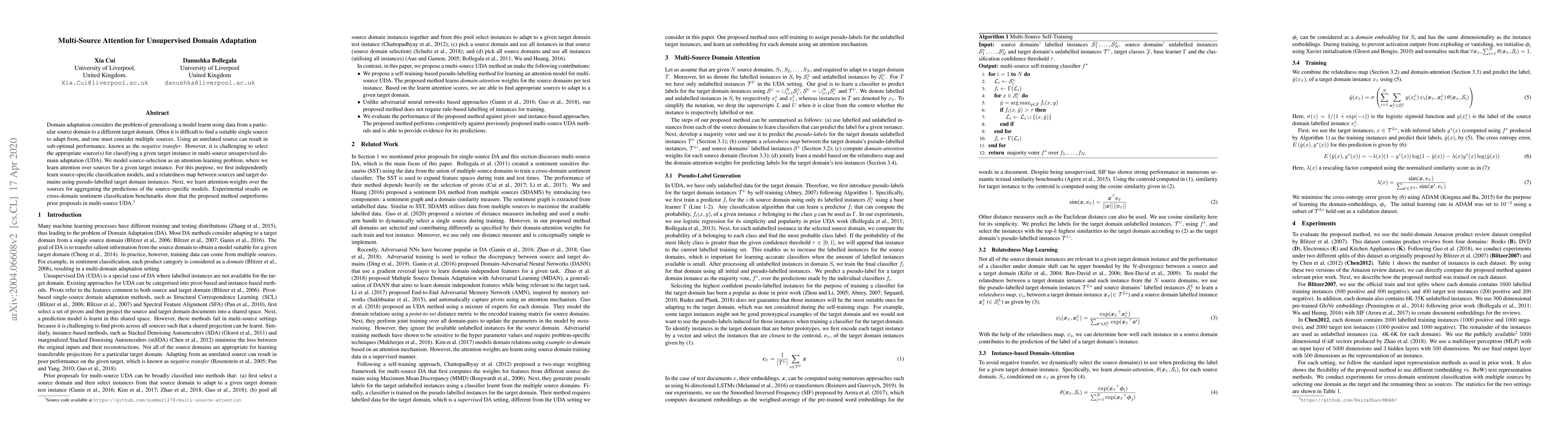 The paper proposes a multi-source attention mechanism for unsupervised domain adaptation, addressing the challenge of selecting appropriate sources to avoid negative transfer. The approach leverages attention learning to aggregate predictions from source-specific models, showing improved performance on cross-domain sentiment classification tasks compared to existing methods.