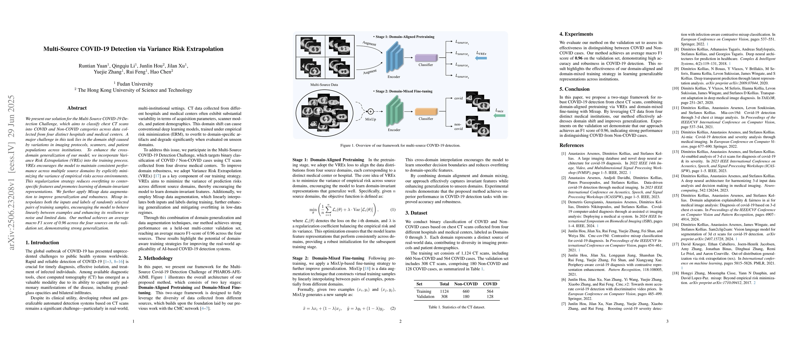 We present our solution for the Multi-Source COVID-19 Detection Challenge, which aims to classify chest CT scans into COVID and Non-COVID categories across data collected from four distinct hospitals and medical centers. A major challenge in this task lies in the domain shift caused by variations in imaging protocols, scanners, and patient populations across institutions. To enhance the cross-domain generalization of our model, we incorporate Variance Risk Extrapolation (VREx) into the training process. VREx encourages the model to maintain consistent performance across multiple source domains by explicitly minimizing the variance of empirical risks across environments. This regularization strategy reduces overfitting to center-specific features and promotes learning of domain-invariant representations. We further apply Mixup data augmentation to improve generalization and robustness. Mixup interpolates both the inputs and labels of randomly selected pairs of training samples, encouraging the model to behave linearly between examples and enhancing its resilience to noise and limited data. Our method achieves an average macro F1 score of 0.96 across the four sources on the validation set, demonstrating strong generalization.
