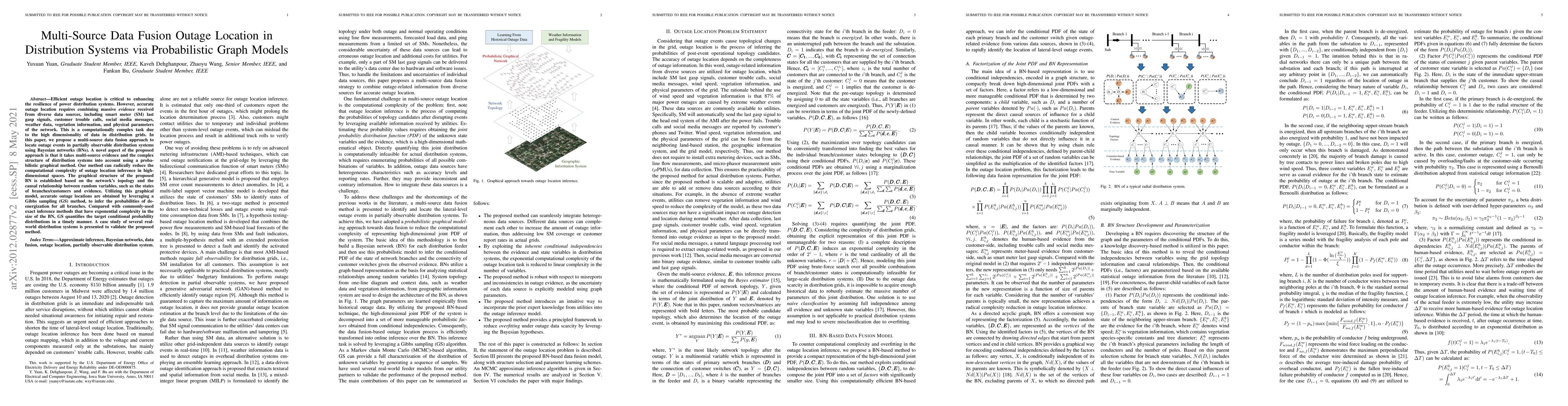 Efficient outage location is critical to enhancing the resilience of power distribution systems. However, accurate outage location requires combining massive evidence received from diverse data sources, including smart meter (SM) last gasp signals, customer trouble calls, social media messages, weather data, vegetation information, and physical parameters of the network. This is a computationally complex task due to the high dimensionality of data in distribution grids. In this paper, we propose a multi-source data fusion approach to locate outage events in partially observable distribution systems using Bayesian networks (BNs). A novel aspect of the proposed approach is that it takes multi-source evidence and the complex structure of distribution systems into account using a probabilistic graphical method. Our method can radically reduce the computational complexity of outage location inference in high-dimensional spaces. The graphical structure of the proposed BN is established based on the network's topology and the causal relationship between random variables, such as the states of branches/customers and evidence. Utilizing this graphical model, accurate outage locations are obtained by leveraging a Gibbs sampling (GS) method, to infer the probabilities of de-energization for all branches. Compared with commonly-used exact inference methods that have exponential complexity in the size of the BN, GS quantifies the target conditional probability distributions in a timely manner. A case study of several real-world distribution systems is presented to validate the proposed method.