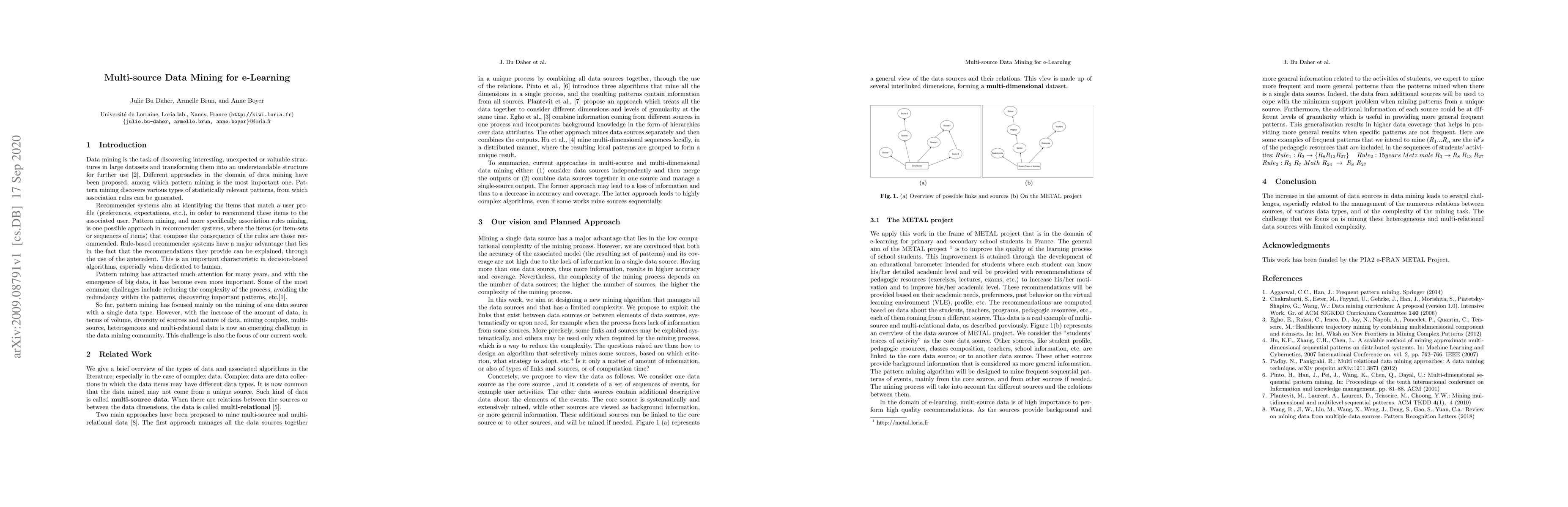 This paper explores the challenge of mining multi-source and heterogeneous data for e-learning, proposing methods to extract valuable frequent patterns from diverse datasets to enhance recommendations and reduce complexity. The focus is on overcoming redundancy and improving the efficiency of pattern mining across various data sources.