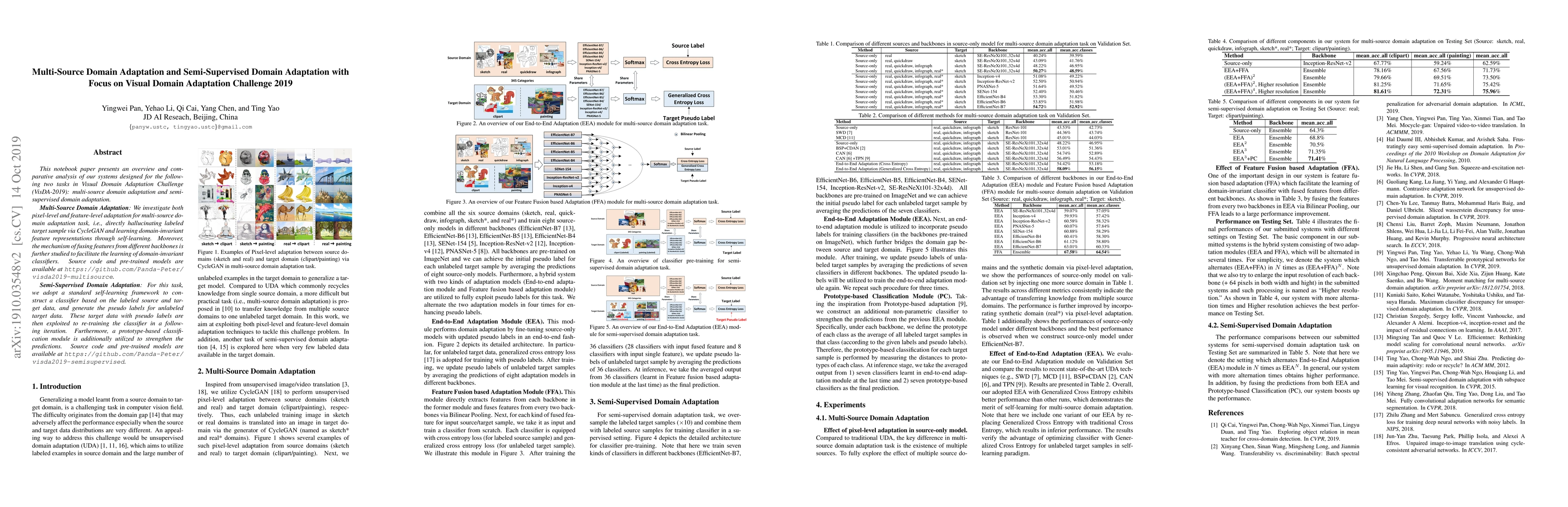 This paper provides an overview and comparative analysis of systems for multi-source and semi-supervised domain adaptation in the Visual Domain Adaptation Challenge 2019. It explores pixel-level and feature-level adaptation techniques for multi-source adaptation and employs self-learning with pseudo label generation for semi-supervised adaptation. Source code and models are available for both approaches.