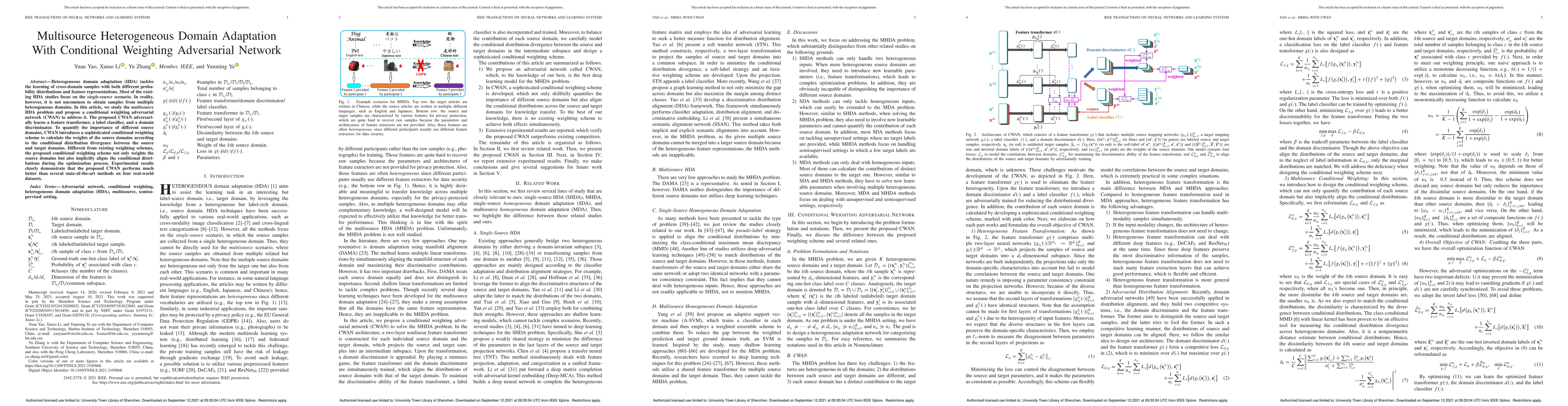This paper proposes a Conditional Weighting Adversarial Network (CWAN) to address the multi-source heterogeneous domain adaptation problem, where it learns a feature transformer, a label classifier, and a domain discriminator. The CWAN introduces a conditional weighting scheme that calculates domain weights based on distribution divergence, improving domain alignment and performance over state-of-the-art methods.