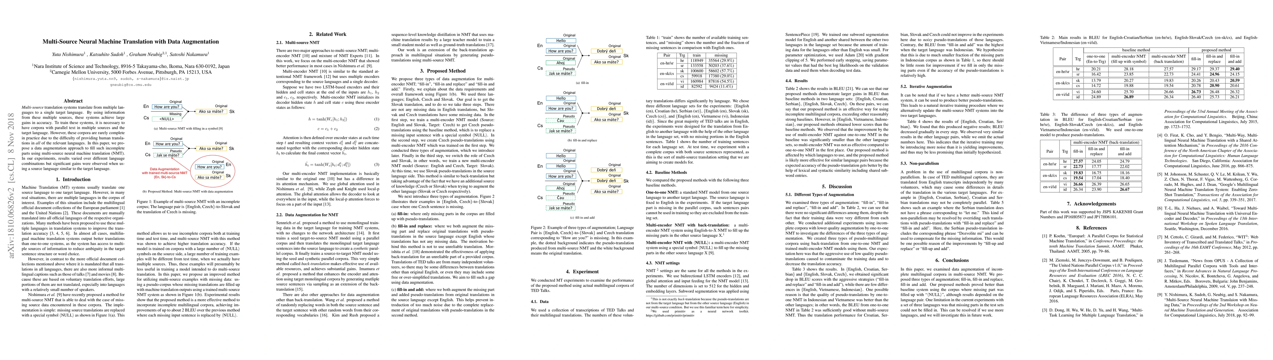 This paper proposes a data augmentation method for multi-source neural machine translation (NMT) to address incomplete parallel corpora. The approach achieves significant accuracy gains, especially when the source language is similar to the target language.