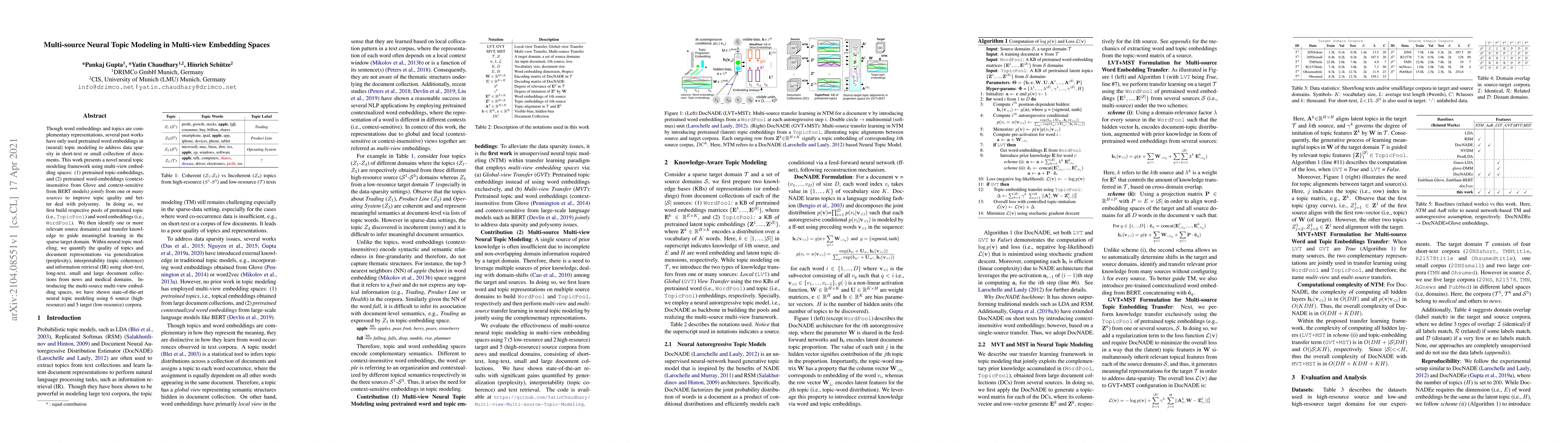 Though word embeddings and topics are complementary representations, several past works have only used pretrained word embeddings in (neural) topic modeling to address data sparsity in short-text or small collection of documents. This work presents a novel neural topic modeling framework using multi-view embedding spaces: (1) pretrained topic-embeddings, and (2) pretrained word-embeddings (context insensitive from Glove and context-sensitive from BERT models) jointly from one or many sources to improve topic quality and better deal with polysemy. In doing so, we first build respective pools of pretrained topic (i.e., TopicPool) and word embeddings (i.e., WordPool). We then identify one or more relevant source domain(s) and transfer knowledge to guide meaningful learning in the sparse target domain. Within neural topic modeling, we quantify the quality of topics and document representations via generalization (perplexity), interpretability (topic coherence) and information retrieval (IR) using short-text, long-text, small and large document collections from news and medical domains. Introducing the multi-source multi-view embedding spaces, we have shown state-of-the-art neural topic modeling using 6 source (high-resource) and 5 target (low-resource) corpora.