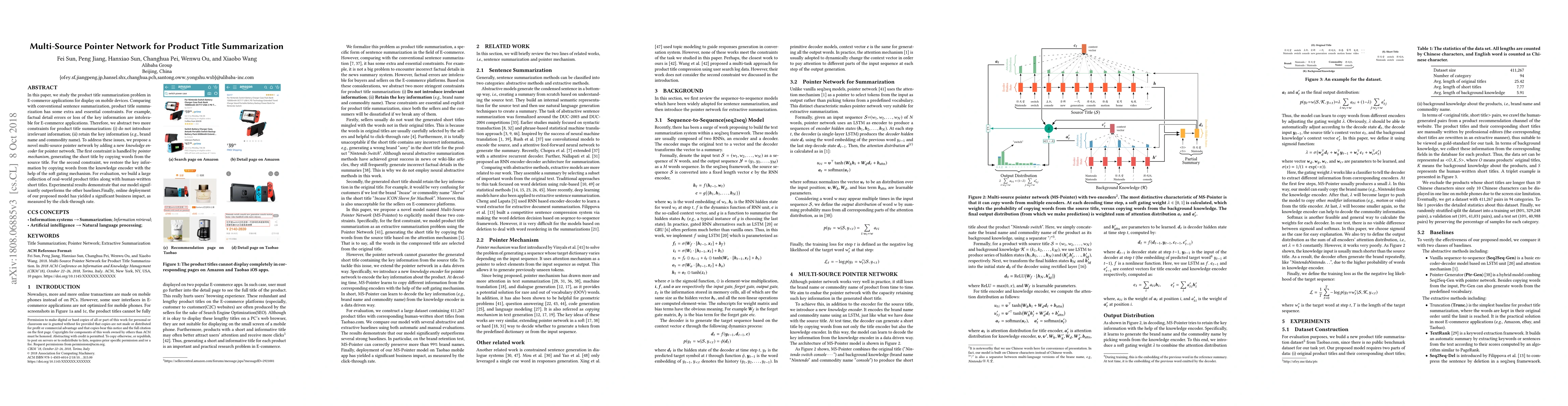 This paper proposes a multi-source pointer network for summarizing product titles in E-commerce, focusing on retaining key information and avoiding irrelevant details. The model uses a knowledge encoder to restore essential information, achieving superior performance over baselines and demonstrating a positive business impact.