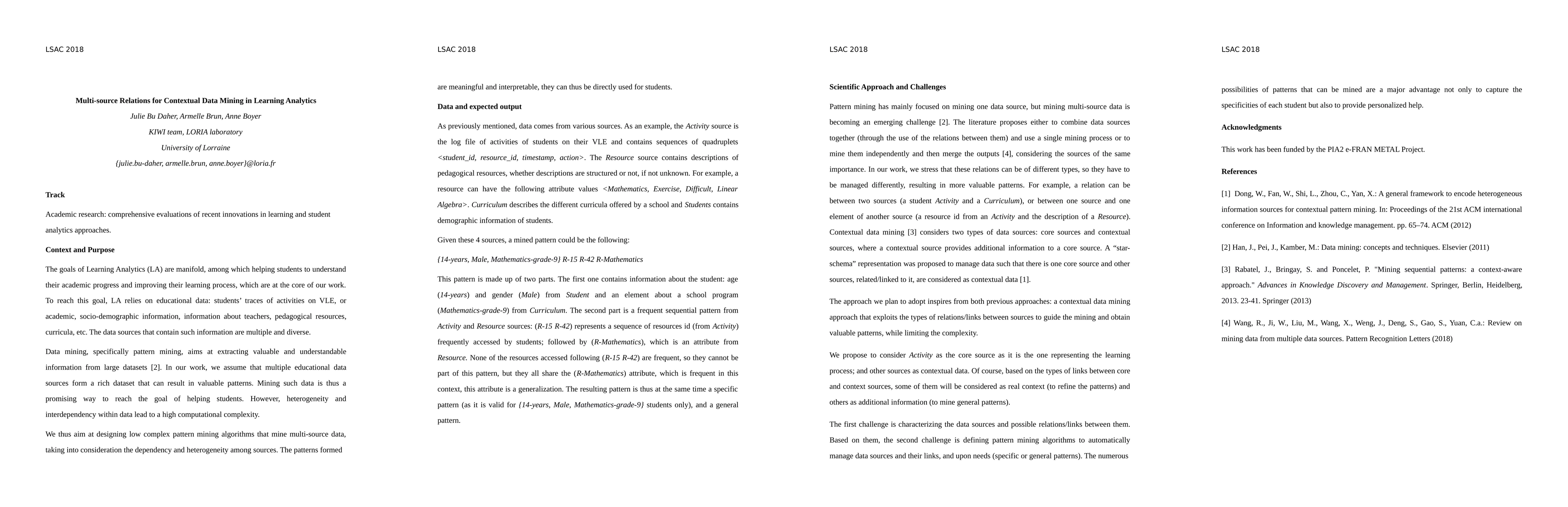 The goals of Learning Analytics (LA) are manifold, among which helping students to understand their academic progress and improving their learning process, which are at the core of our work. To reach this goal, LA relies on educational data: students' traces of activities on VLE, or academic, socio-demographic information, information about teachers, pedagogical resources, curricula, etc. The data sources that contain such information are multiple and diverse. Data mining, specifically pattern mining, aims at extracting valuable and understandable information from large datasets. In our work, we assume that multiple educational data sources form a rich dataset that can result in valuable patterns. Mining such data is thus a promising way to reach the goal of helping students. However, heterogeneity and interdependency within data lead to high computational complexity. We thus aim at designing low complex pattern mining algorithms that mine multi-source data, taking into consideration the dependency and heterogeneity among sources. The patterns formed are meaningful and interpretable, they can thus be directly used for students.