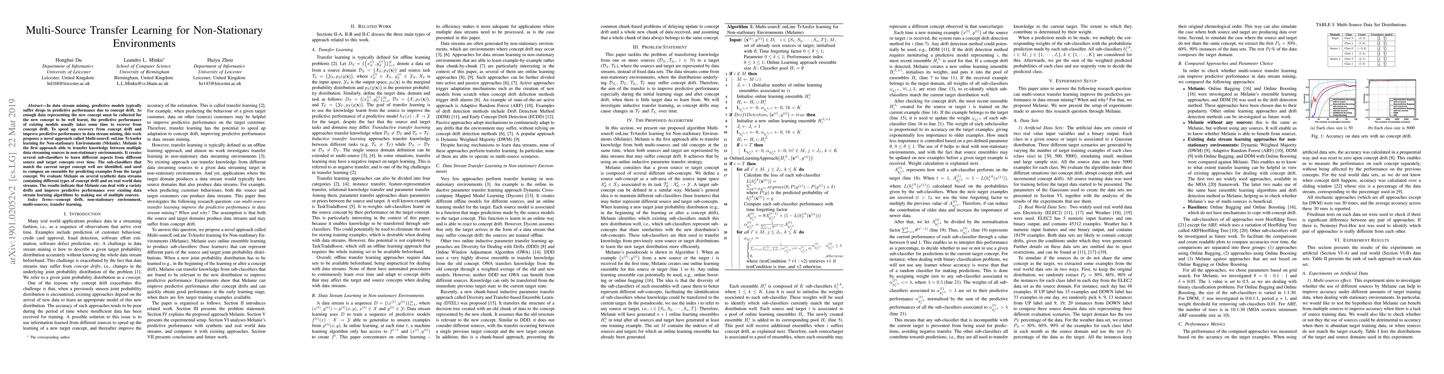 This paper proposes Melanie, a novel multi-source online transfer learning approach for non-stationary environments to improve predictive performance in data stream mining by quickly adapting to concept drift through knowledge transfer between multiple data sources. Experimental results show Melanie outperforms existing methods by effectively utilizing multiple sources to handle various types of concept drift.