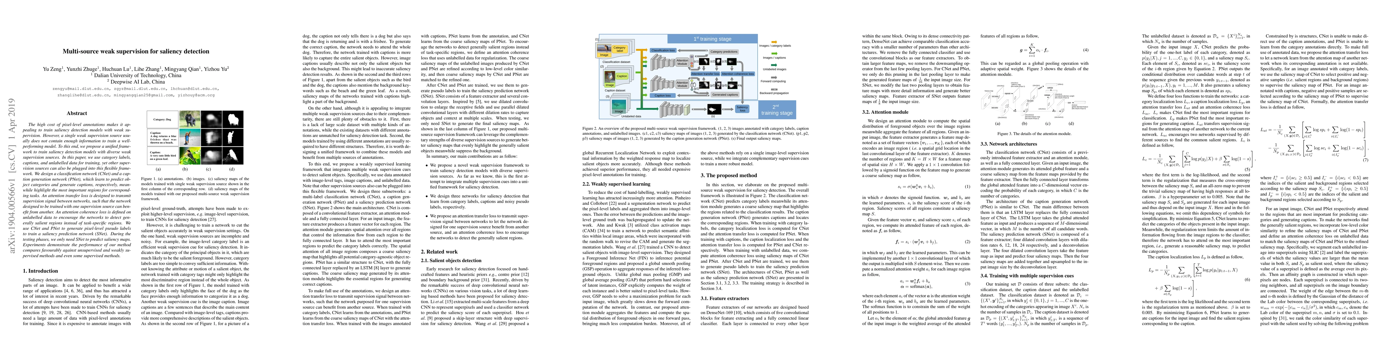 This paper proposes a unified framework for saliency detection using multi-source weak supervision, combining category labels, captions, and unlabeled data. It employs a classification network and a caption generation network to highlight important regions, with an attention transfer loss to share supervision signals between them.