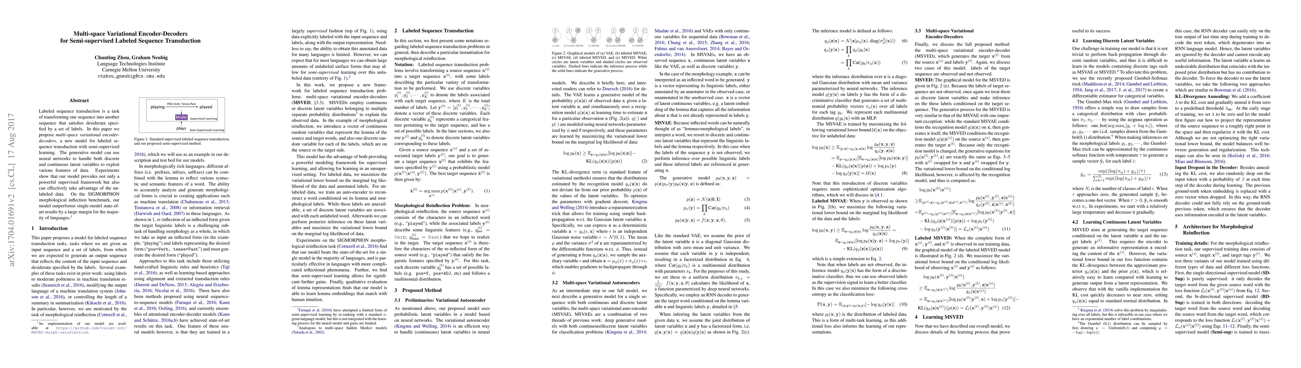 This paper introduces multi-space variational encoder-decoders for semi-supervised labeled sequence transduction, leveraging neural networks to handle both discrete and continuous latent variables. The model effectively utilizes unlabeled data, outperforming state-of-the-art on the SIGMORPHON morphological inflection benchmark.