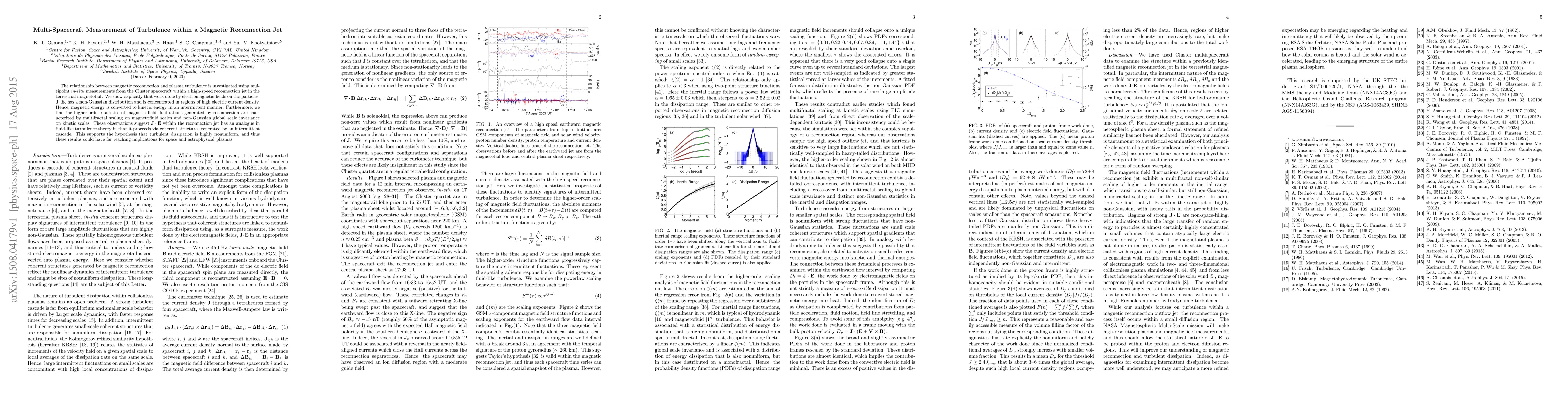 This study uses Cluster spacecraft measurements to investigate the turbulence in a magnetic reconnection jet, revealing that electromagnetic work on particles follows a non-Gaussian distribution concentrated in high current density regions. The findings suggest that magnetic energy converts to kinetic energy intermittently, with turbulence characterized by multifractal scaling and non-Gaussian global scale invariance, supporting the hypothesis of nonuniform turbulent dissipation in space and astrophysical plasmas.