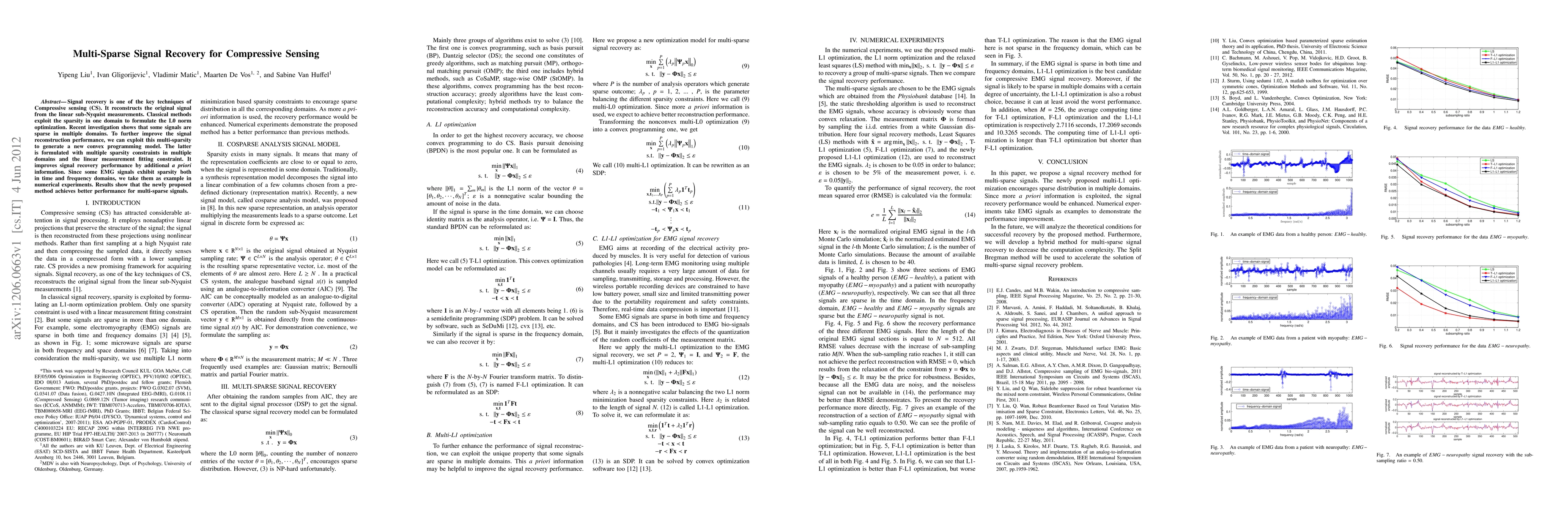 This paper proposes a new convex programming model for compressive sensing that leverages multi-sparsity across multiple domains to enhance signal recovery performance. The method demonstrates superior reconstruction results for signals like EMG that are sparse in both time and frequency domains.