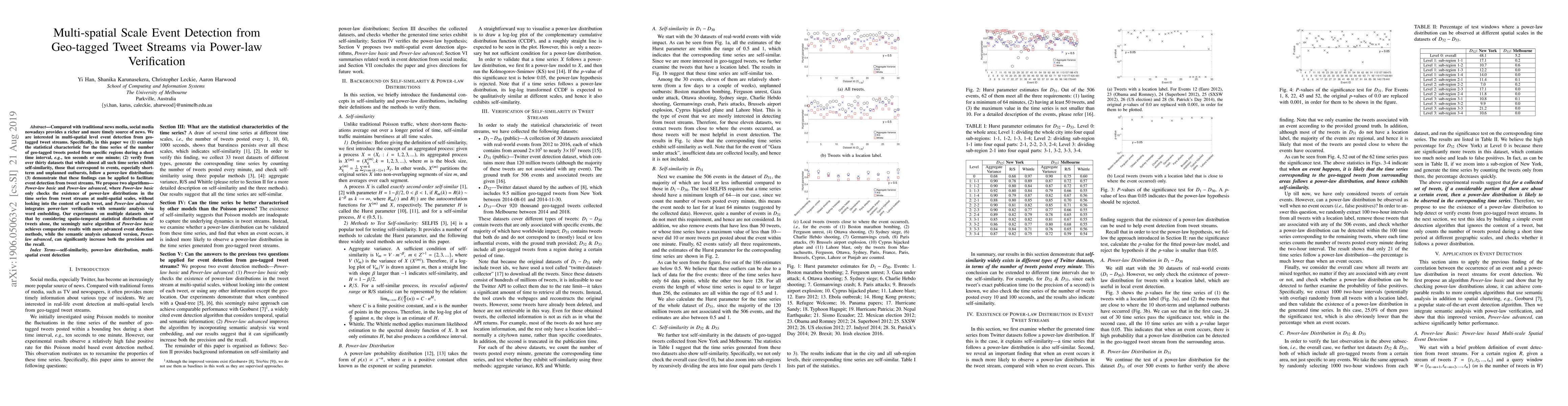 The paper examines the statistical characteristics of time series of geo-tagged tweets from specific regions over short intervals, verifies power-law distributions in event-related tweet streams across 30 datasets, and proposes Power-law basic and Power-law advanced algorithms for event detection.