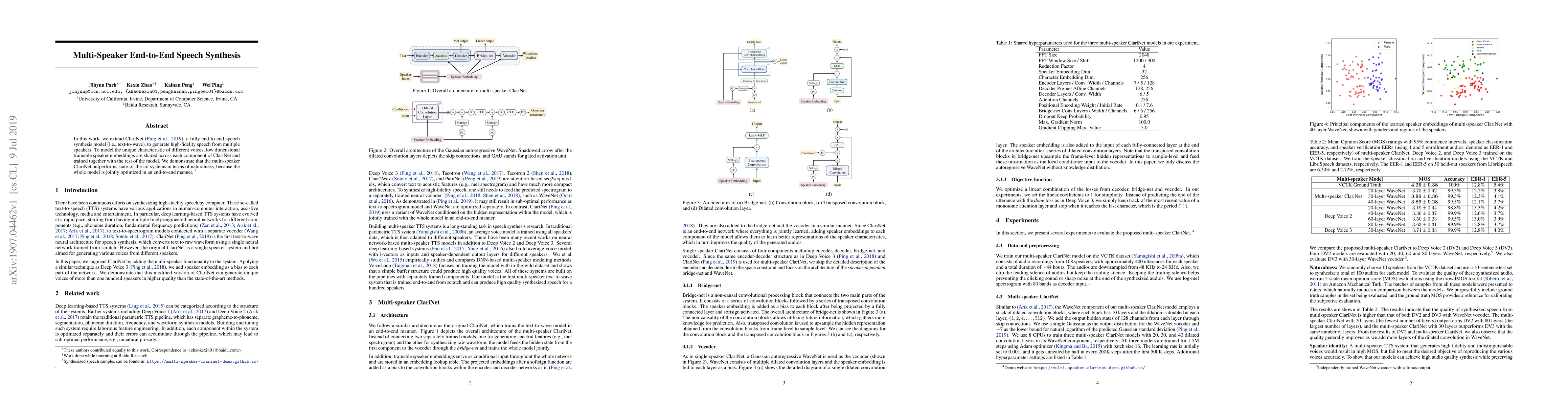 The research extends ClariNet (Ping et al., 2019) to a multi-speaker end-to-end speech synthesis model by incorporating low-dimensional trainable speaker embeddings shared across each component, which are trained jointly with the rest of the model.