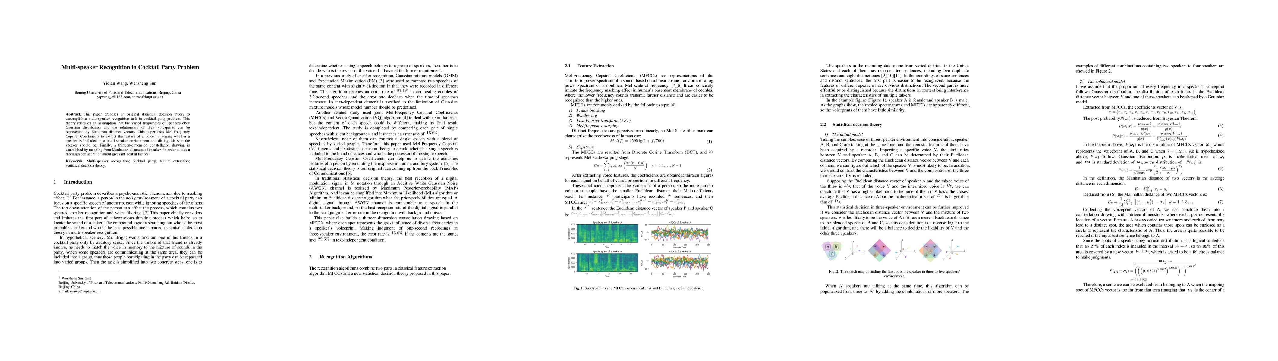 This paper proposes an original statistical decision theory to accomplish a multi-speaker recognition task in cocktail party problem. This theory relies on an assumption that the varied frequencies of speakers obey Gaussian distribution and the relationship of their voiceprints can be represented by Euclidean distance vectors. This paper uses Mel-Frequency Cepstral Coefficients to extract the feature of a voice in judging whether a speaker is included in a multi-speaker environment and distinguish who the speaker should be. Finally, a thirteen-dimension constellation drawing is established by mapping from Manhattan distances of speakers in order to take a thorough consideration about gross influential factors.