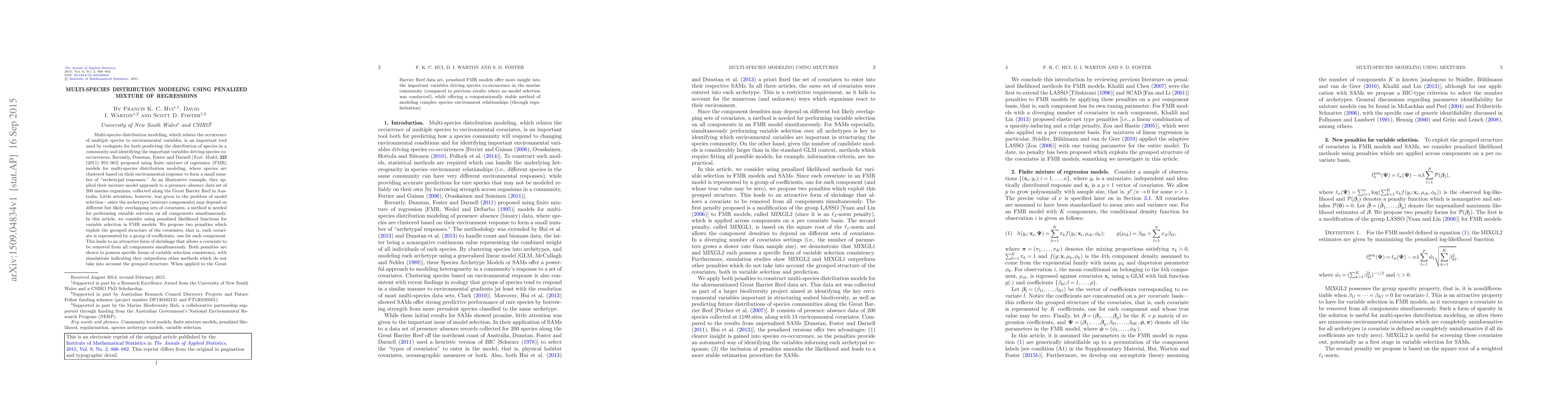 This paper proposes penalized mixture of regressions for multi-species distribution modeling, introducing two penalties for variable selection that exploit the grouped structure of covariates. The method outperforms traditional approaches and offers better insights into species co-occurrences and environmental relationships.