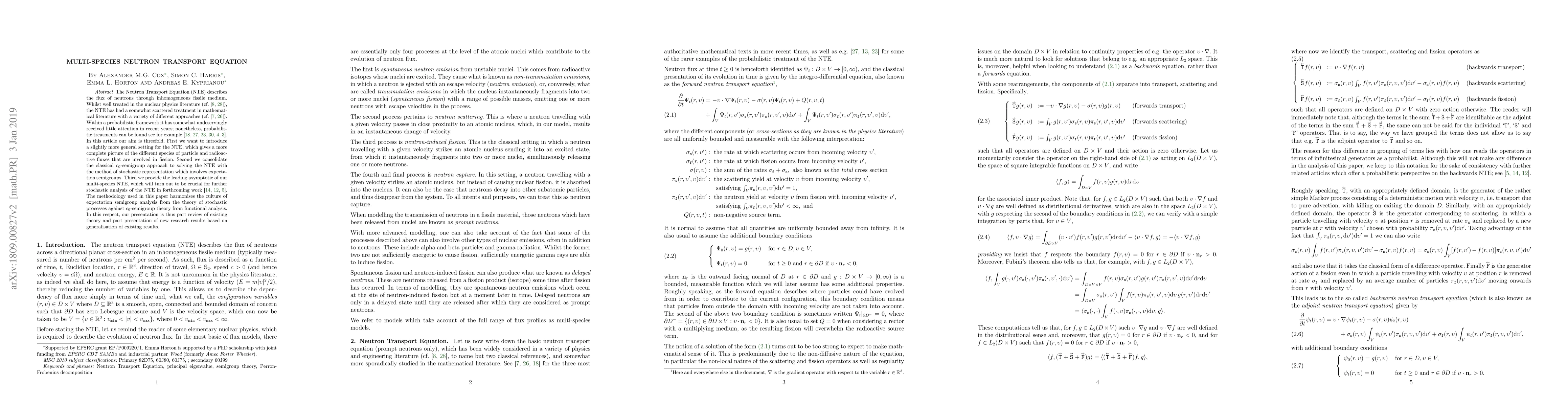 The Neutron Transport Equation (NTE) describes the flux of neutrons through inhomogeneous fissile medium. Whilst well treated in the nuclear physics literature (cf. [9, 27]), the NTE has had a somewhat scattered treatment in mathematical literature with a variety of different approaches (cf. [8, 25]). Within a probabilistic framework it has somewhat undeservingly received little attention in recent years; nonetheless, probabilistic treatments can be found see for example [19, 26, 24, 29, 4, 3]. In this article our aim is threefold. First we want to introduce a slightly more general setting for the NTE, which gives a more complete picture of the different species of particle and radioactive fluxes that are involved in fission. Second we consolidate the classical c0-semigroup approach to solving the NTE with the method of stochastic representation which involves expectation semigroups. Third we provide the leading asymptotic of our multi-species NTE, which will turn out to be crucial for further stochastic analysis of the NTE in forthcoming work [6, 5]. The methodology used in this paper harmonises the culture of expectation semigroup analysis from the theory of stochastic processes against c0-semigroup theory from functional analysis. In this respect, our presentation is thus part review of existing theory and part presentation of new research results based on generalisation of existing results.