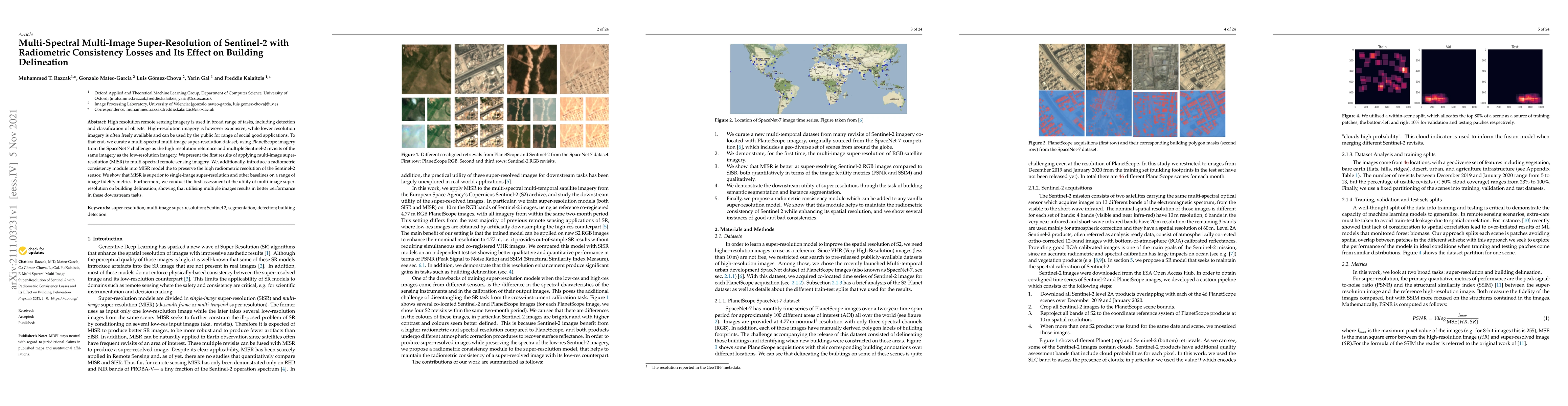 This paper presents a multi-image super-resolution (MISR) method for enhancing multi-spectral Sentinel-2 imagery, incorporating a radiometric consistency loss to preserve sensor fidelity. The approach outperforms single-image super-resolution and other baselines, significantly improving building delineation tasks.