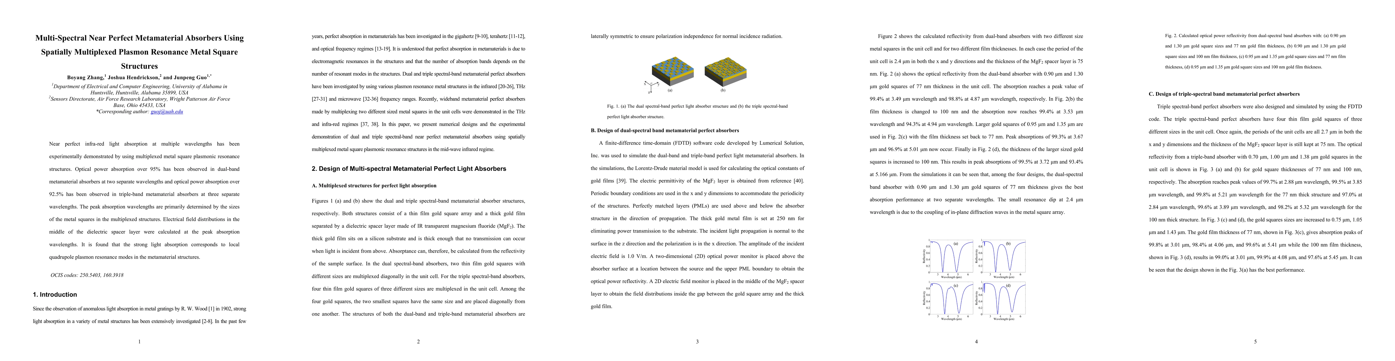 This paper demonstrates near perfect multi-spectral infrared light absorption using multiplexed metal square plasmon resonance structures, achieving over 95% absorption in dual-band and over 92.5% in triple-band metamaterial absorbers. The peak absorption wavelengths are controlled by the sizes of the metal squares, and strong absorption correlates with local quadrupole plasmon resonance modes.