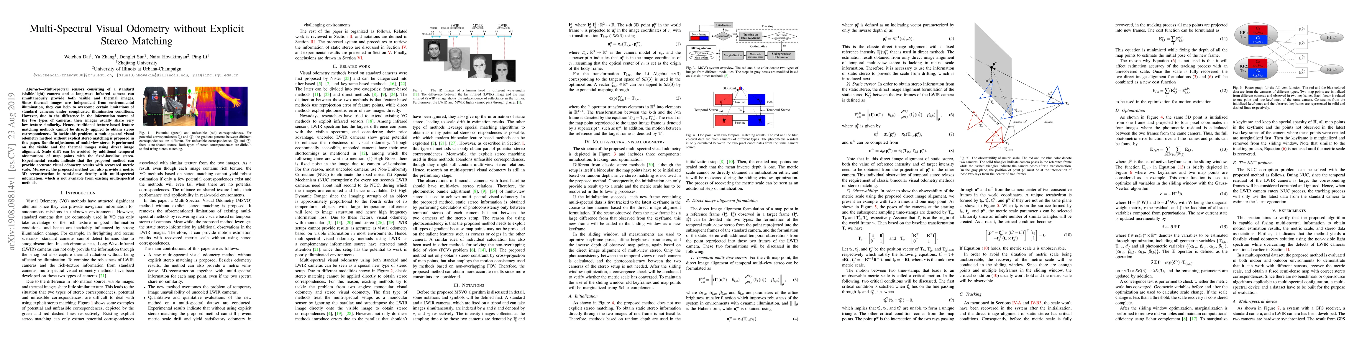 This paper proposes a multi-spectral visual odometry method that leverages both visible and thermal images from different sensors to achieve accurate visual odometry without relying on explicit stereo matching. The method uses direct image alignment for bundle adjustment and temporal observations to avoid scale drift, providing accurate metric 3D reconstruction.