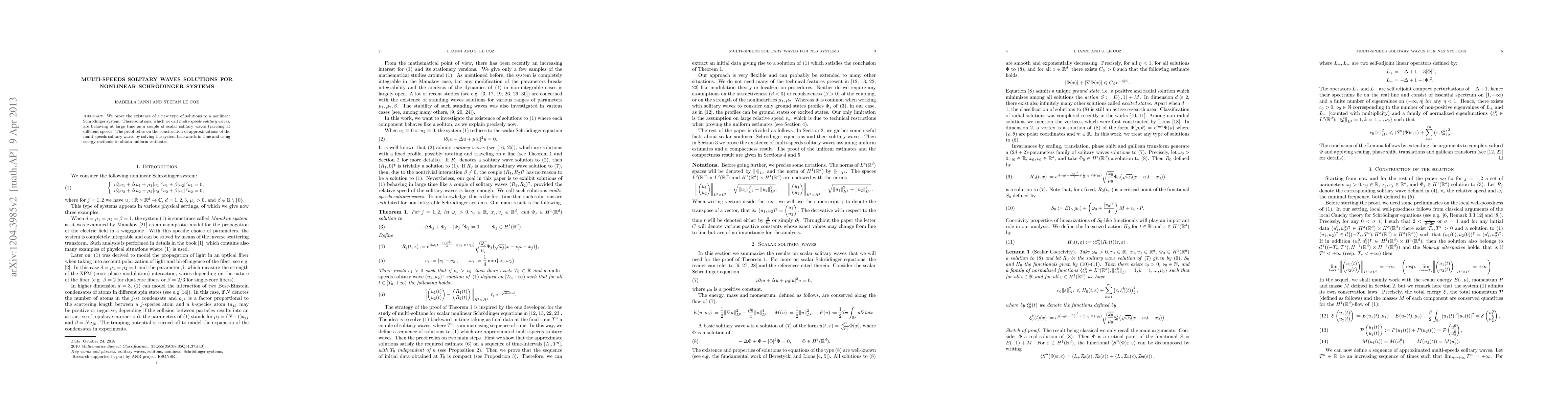 The paper establishes the existence of "multi-speeds solitary waves" in nonlinear Schrödinger systems, characterized by traveling scalar solitary waves at different speeds. The proof utilizes backward time solutions and energy methods for uniform estimates.