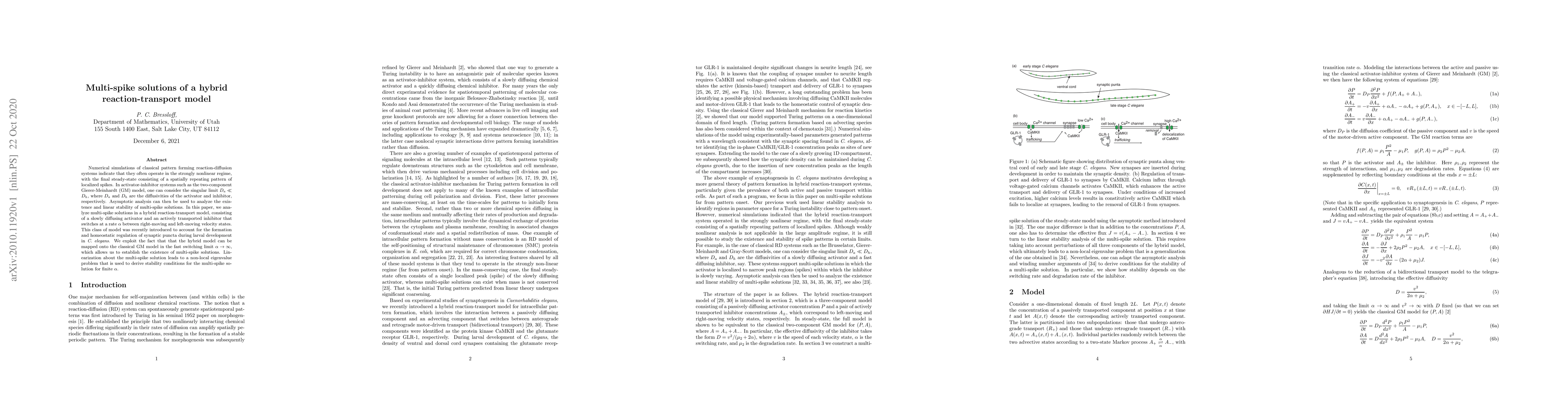 Researchers analyzed a hybrid reaction-transport model to understand the formation of localized spikes in biological systems, finding that multi-spike solutions exist and can be stabilized under certain conditions.