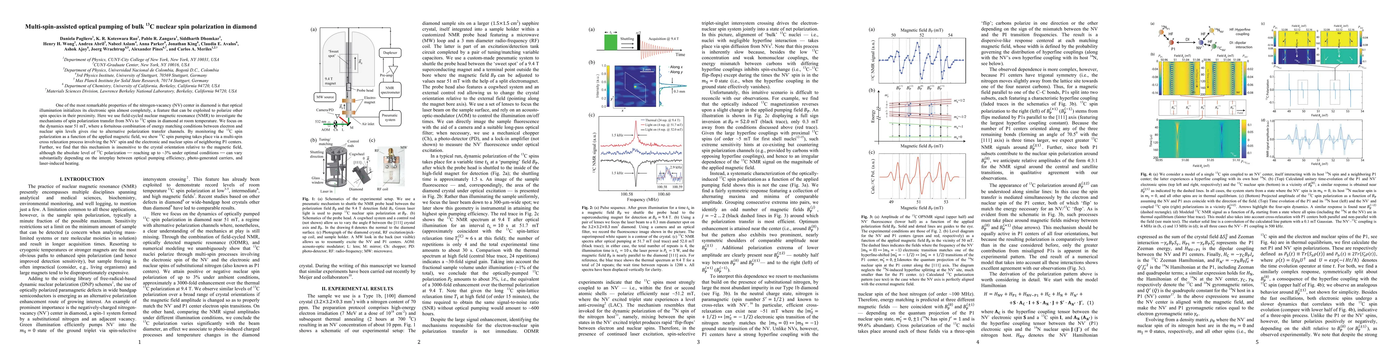 One of the most remarkable properties of the nitrogen-vacancy (NV) center in diamond is that optical illumination initializes its electronic spin almost completely, a feature that can be exploited to polarize other spin species in their proximity. Here we use field-cycled nuclear magnetic resonance (NMR) to investigate the mechanisms of spin polarization transfer from NVs to 13C spins in diamond at room temperature. We focus on the dynamics near 51 mT, where a fortuitous combination of energy matching conditions between electron and nuclear spin levels gives rise to alternative polarization transfer channels. By monitoring the 13C spin polarization as a function of the applied magnetic field, we show 13C spin pumping takes place via a multi-spin cross relaxation process involving the NV- spin and the electronic and nuclear spins of neighboring P1 centers. Further, we find that this mechanism is insensitive to the crystal orientation relative to the magnetic field, although the absolute level of 13C polarization - reaching up to ~3% under optimal conditions - can vary substantially depending on the interplay between optical pumping efficiency, photo-generated carriers, and laser-induced heating.