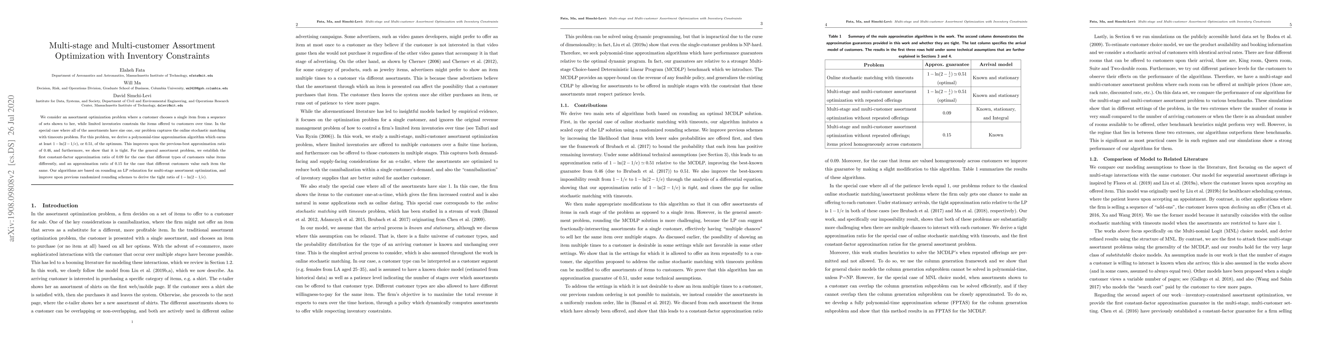This research presents approximation algorithms for multi-stage and multi-customer assortment optimization under inventory constraints. It improves the approximation ratio for the online stochastic matching with timeouts problem to 0.51, up from the previous 0.46. For the general assortment problem, it establishes a constant-factor approximation ratio of 0.09 for diverse customer item valuations and 0.15 for uniform item valuation among customers. The algorithms are based on LP relaxation rounding, enhancing previous randomized schemes.
