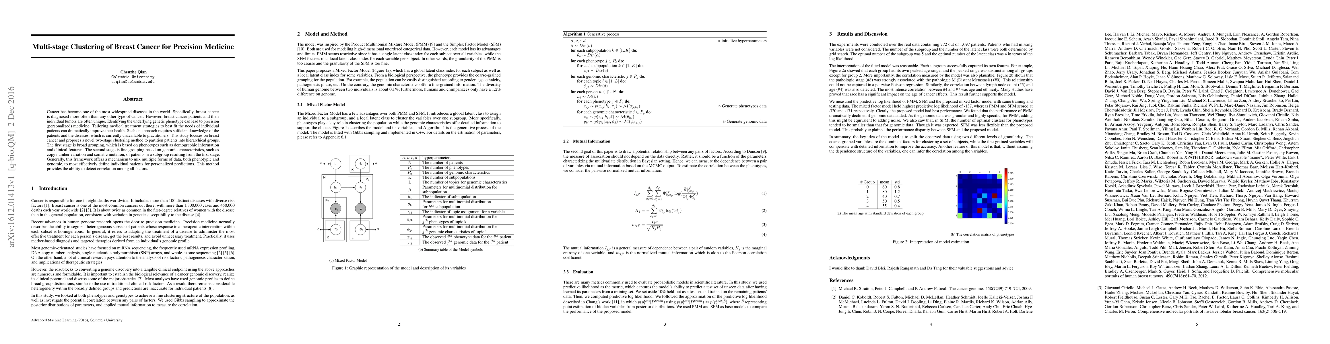 Cancer has become one of the most widespread diseases in the world. Specifically, breast cancer is diagnosed more often than any other type of cancer. However, breast cancer patients and their individual tumors are often unique. Identifying the underlying genetic phenotype can lead to precision (personalized) medicine. Tailoring medical treatment strategies to best fit the needs of individual patients can dramatically improve their health. Such an approach requires sufficient knowledge of the patients and the diseases, which is currently unavailable to practitioners. This study focuses on breast cancer and proposes a novel two-stage clustering method to partition patients into hierarchical groups. The first stage is broad grouping, which is based on phenotypes such as demographic information and clinical features. The second stage is fine grouping based on genomic characteristics, such as copy number variation and somatic mutation, of patients in a subgroup resulting from the first stage. Generally, this framework offers a mechanism to mix multiple forms of data, both phenotypic and genomic, to most effectively define individual patients for personalized predictions. This method provides the ability to detect correlation among all factors.