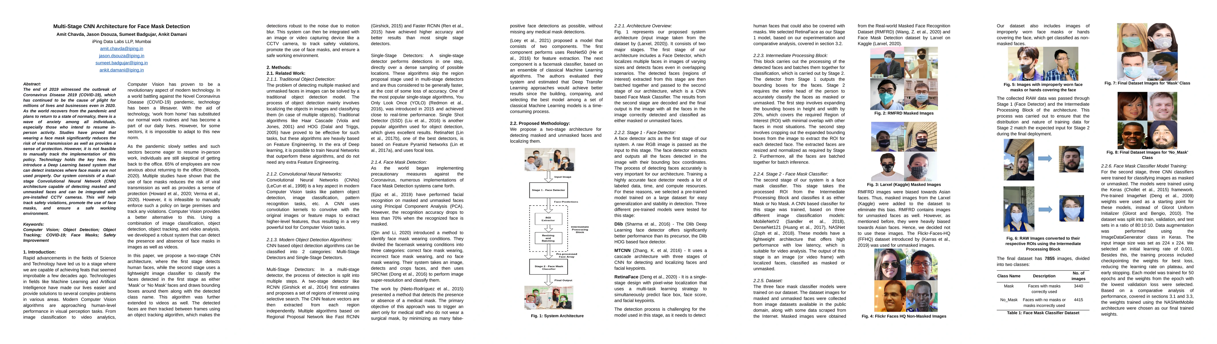 The end of 2019 witnessed the outbreak of Coronavirus Disease 2019 (COVID-19), which has continued to be the cause of plight for millions of lives and businesses even in 2020. As the world recovers from the pandemic and plans to return to a state of normalcy, there is a wave of anxiety among all individuals, especially those who intend to resume in-person activity. Studies have proved that wearing a face mask significantly reduces the risk of viral transmission as well as provides a sense of protection. However, it is not feasible to manually track the implementation of this policy. Technology holds the key here. We introduce a Deep Learning based system that can detect instances where face masks are not used properly. Our system consists of a dual-stage Convolutional Neural Network (CNN) architecture capable of detecting masked and unmasked faces and can be integrated with pre-installed CCTV cameras. This will help track safety violations, promote the use of face masks, and ensure a safe working environment.