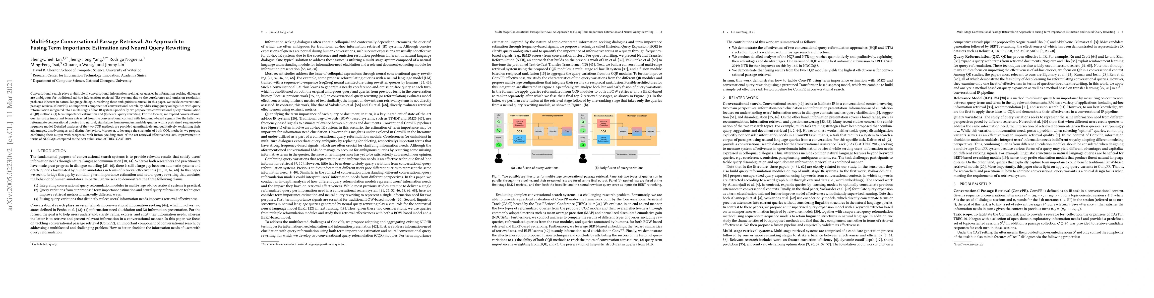 This research proposes a multi-stage approach for conversational passage retrieval that integrates term importance estimation and neural query rewriting to resolve ambiguities in conversational search queries. It combines two query reformulation methods, showing a 30% improvement in retrieval effectiveness over existing methods.
