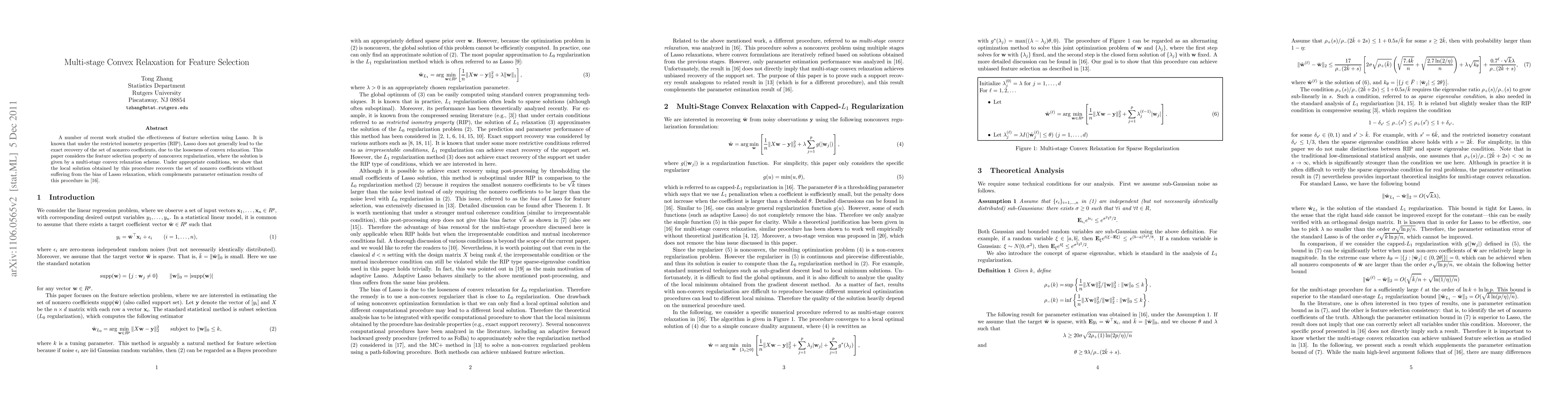 This paper introduces a multi-stage convex relaxation method for feature selection, addressing Lasso's limitation in exact coefficient recovery under RIP. The new approach, utilizing nonconvex regularization, is shown to recover the nonzero coefficient set without Lasso's bias, offering an improvement in feature selection.
